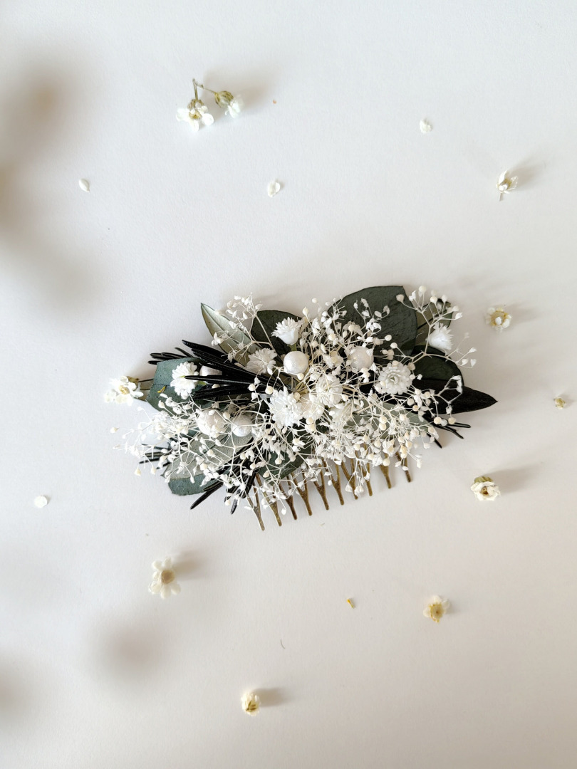 The flower hair comb is made of preserved leaves, flowers and other arranging material.