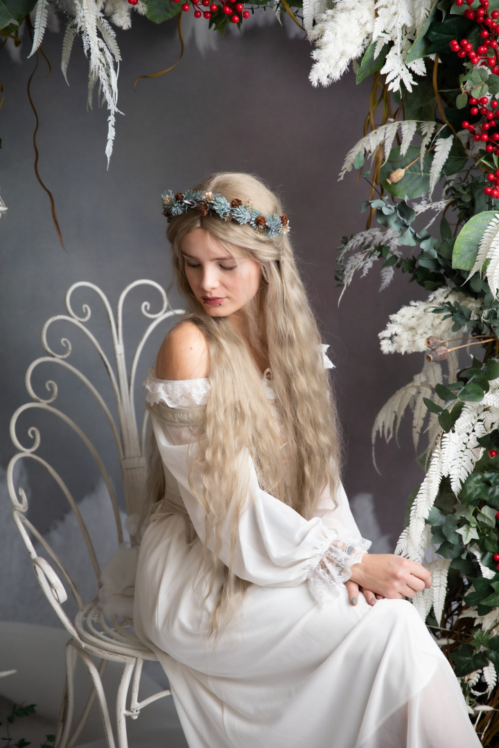 The flower half wreath is made of artificial pine needles, pine cones and other arranging material.