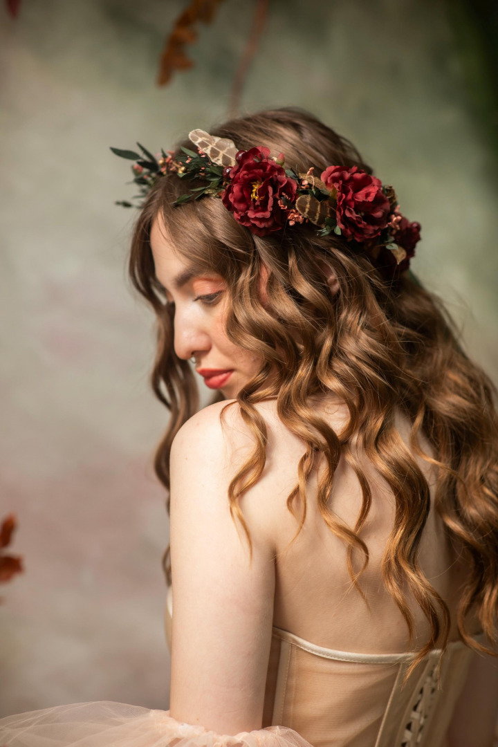 Burgundy flower wreath Woodland flower crown Wreath with feathers Autumn flower wreath Woodland wedding Golden leaves Cottagecore