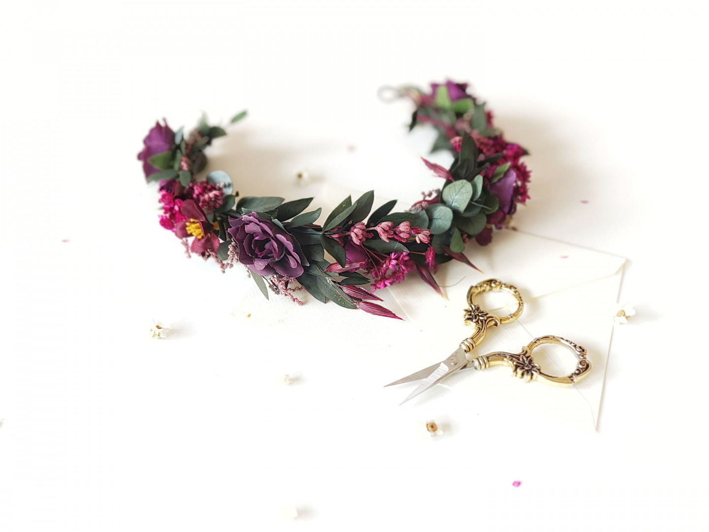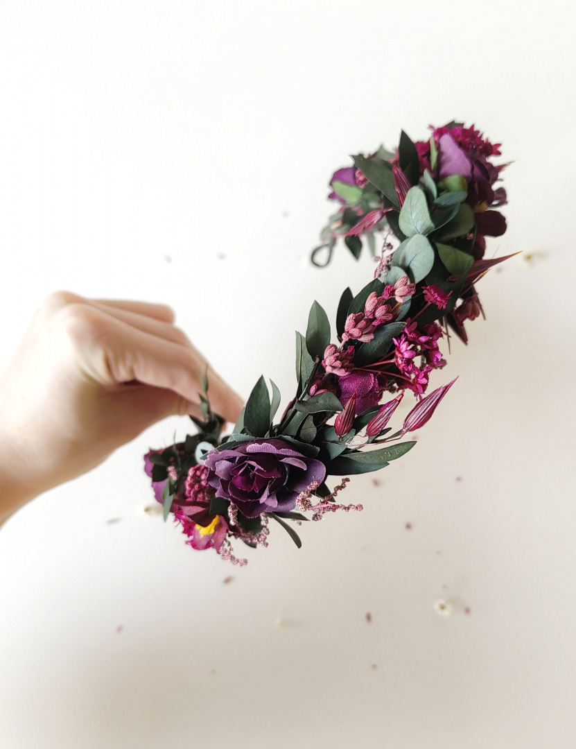 Handmade wedding half flower wreath in dark purple colours.