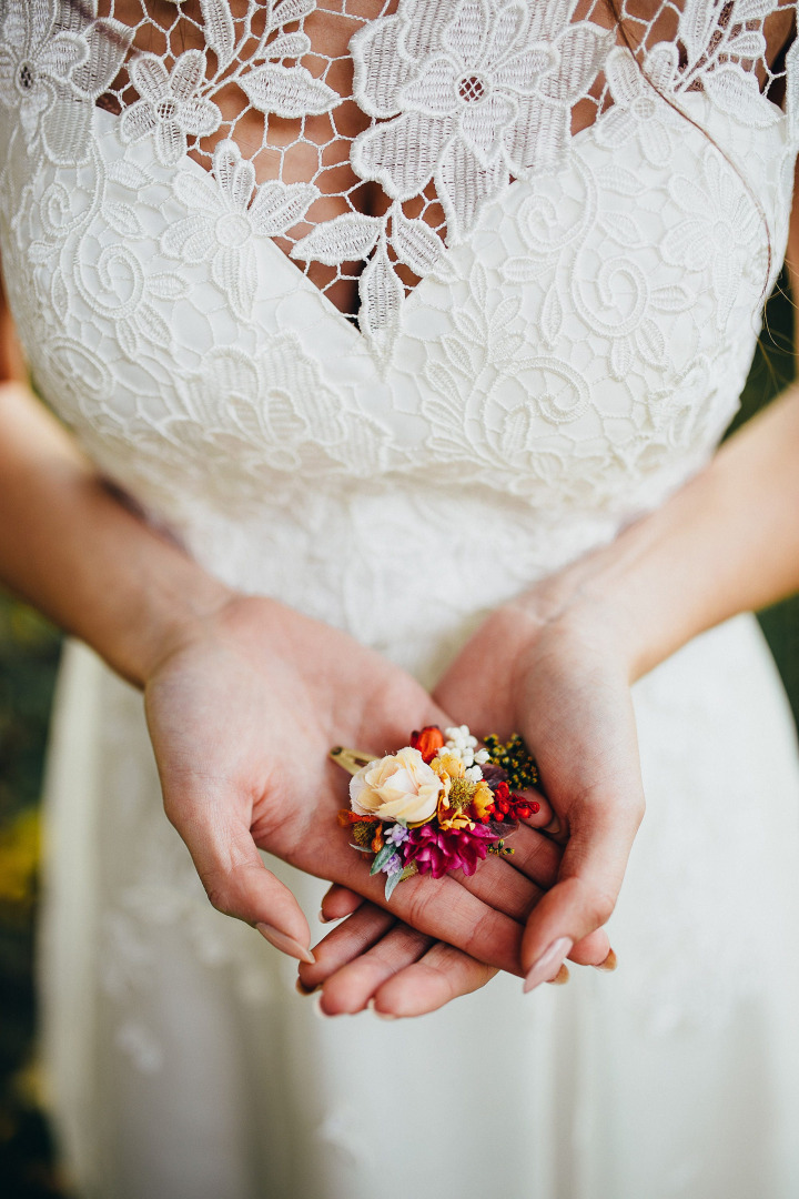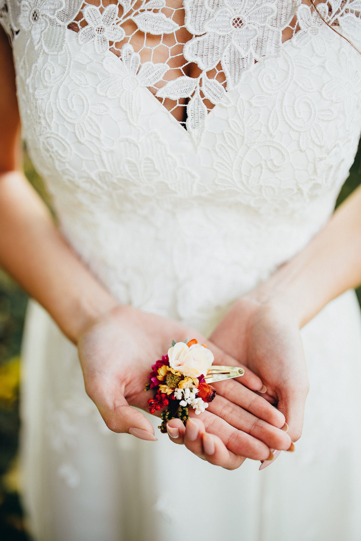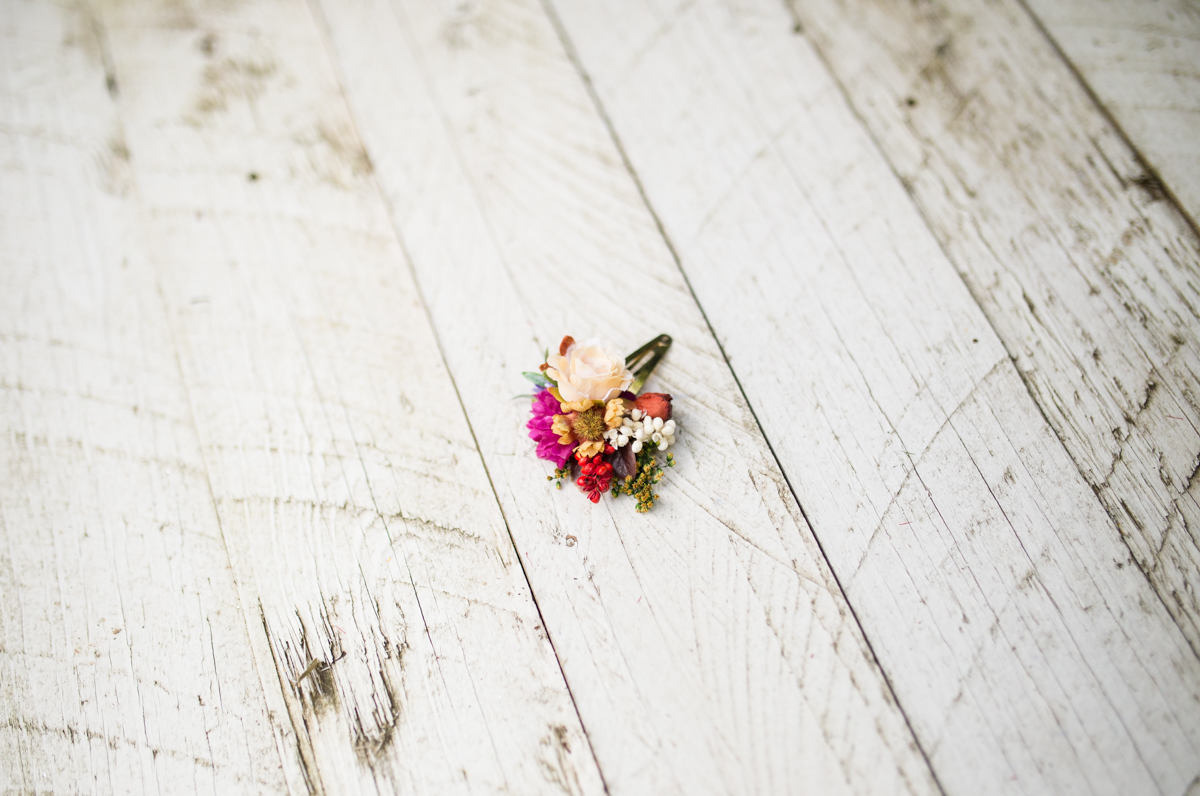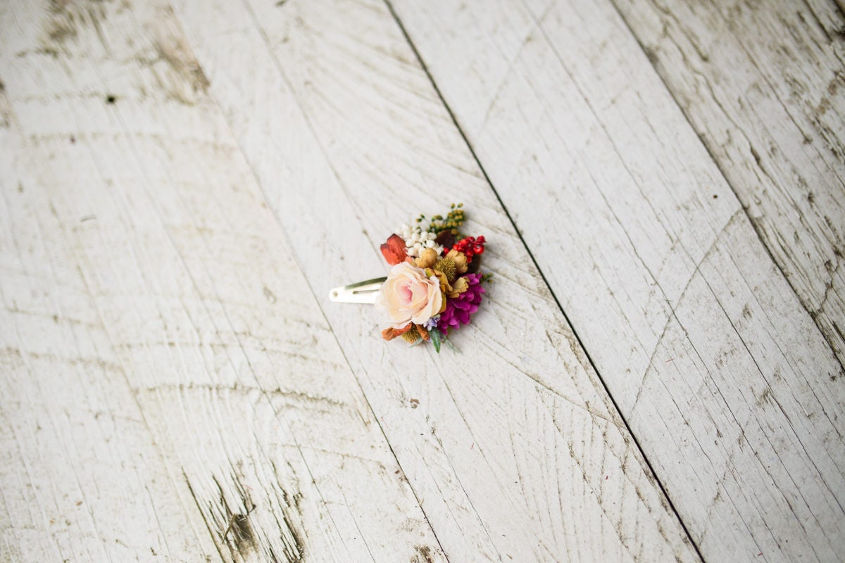 Colourful flower hair clip. Made of artificial/fabric and preserved flowers and leaves.