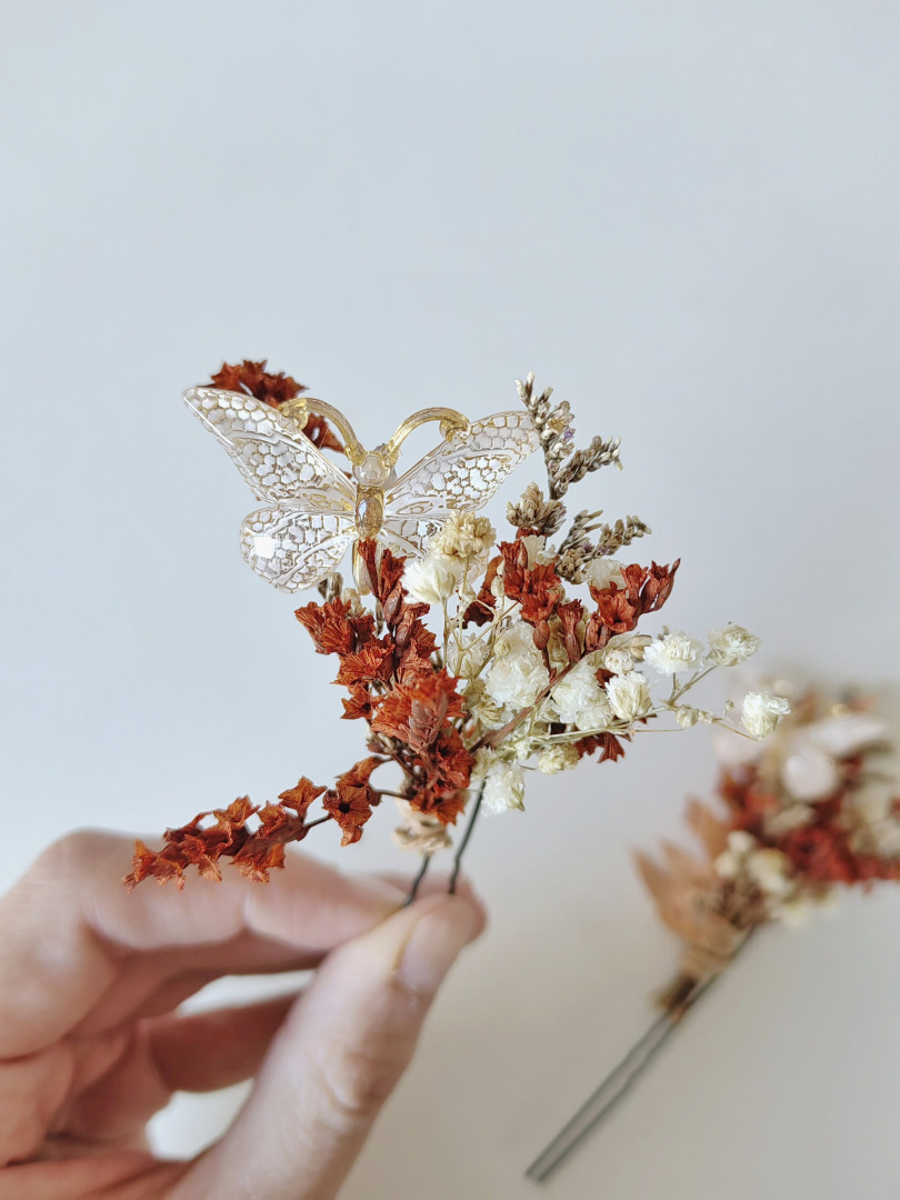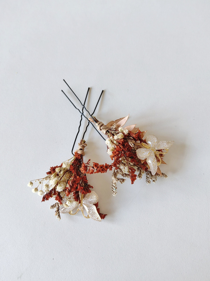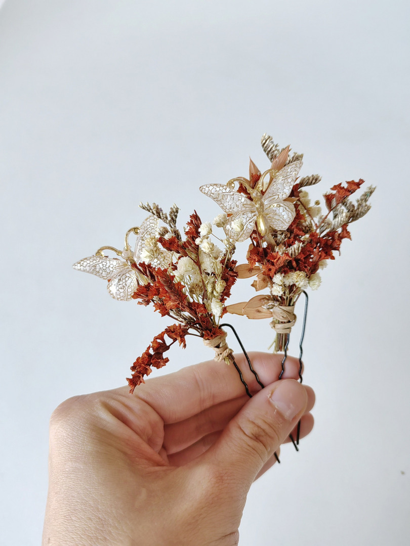 The hairpins are made of preserved material, feathers and other arranging material.