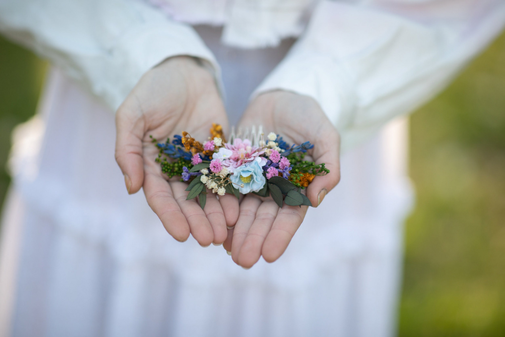 The hair comb is made of artificial and preserved flowers, leaves, grass and other trinkets used for arranging.