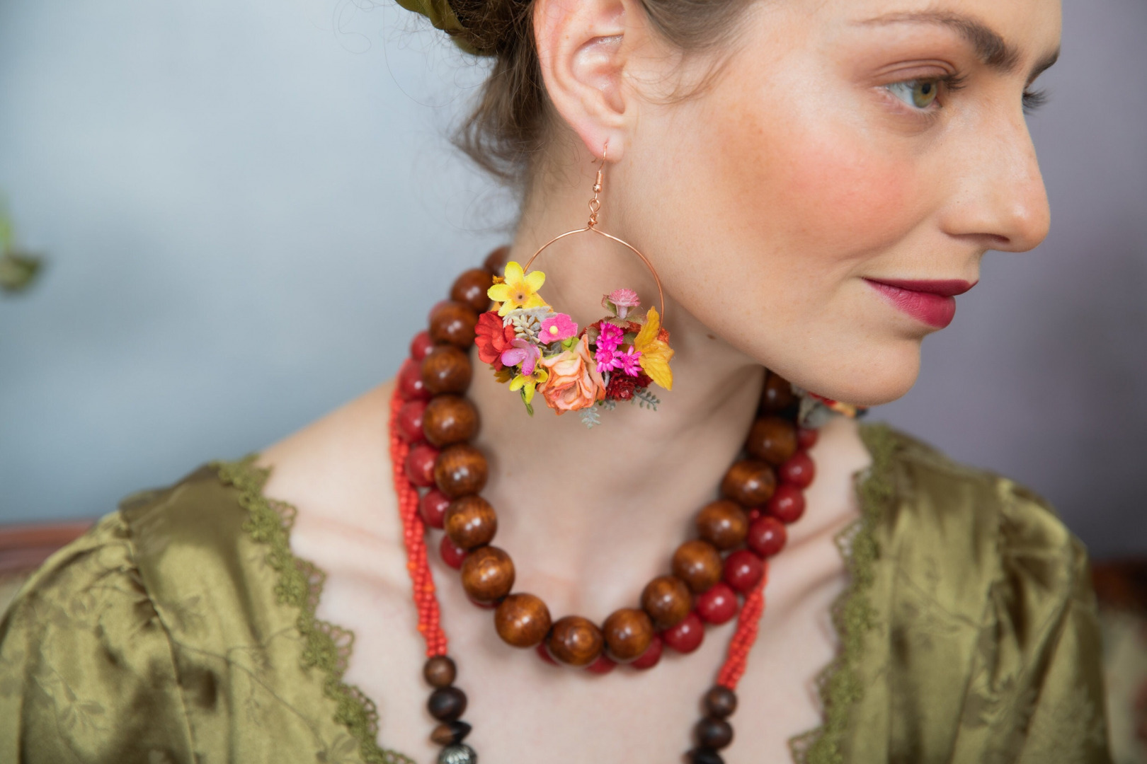 The earrings are made of artificial flowers, preserved flowers, leaves and grass, wire, and other trinkets used for arranging :)