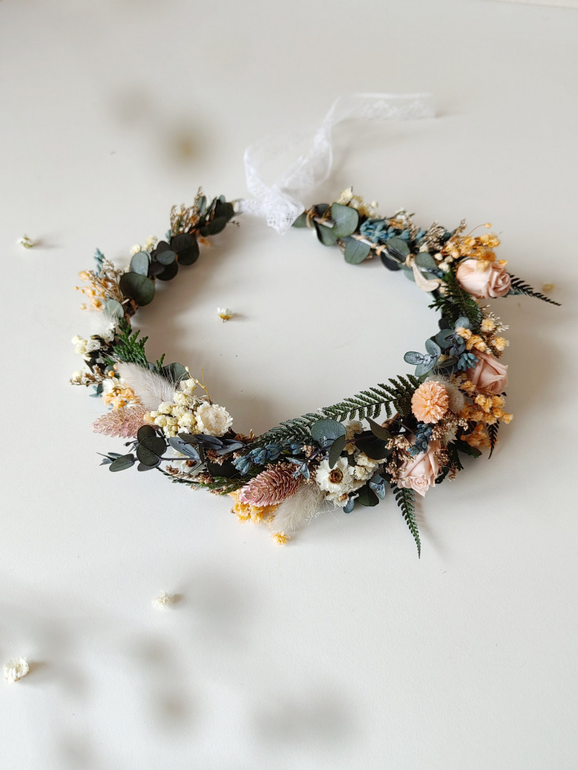 I also like to bring you something special that will underline the specialness of your wedding day and your personality. And this set is definitely exceptional. Hair wreath, hair vine/comb and corsage, made only from preserved materials, including roses...