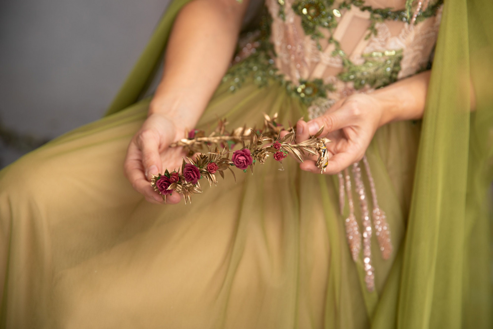 Flower elven tiara with a bee Fairy hair crown Golden and burgundy flower elf crown Bridal flower crown Halloween tiara Magaela Wooldland