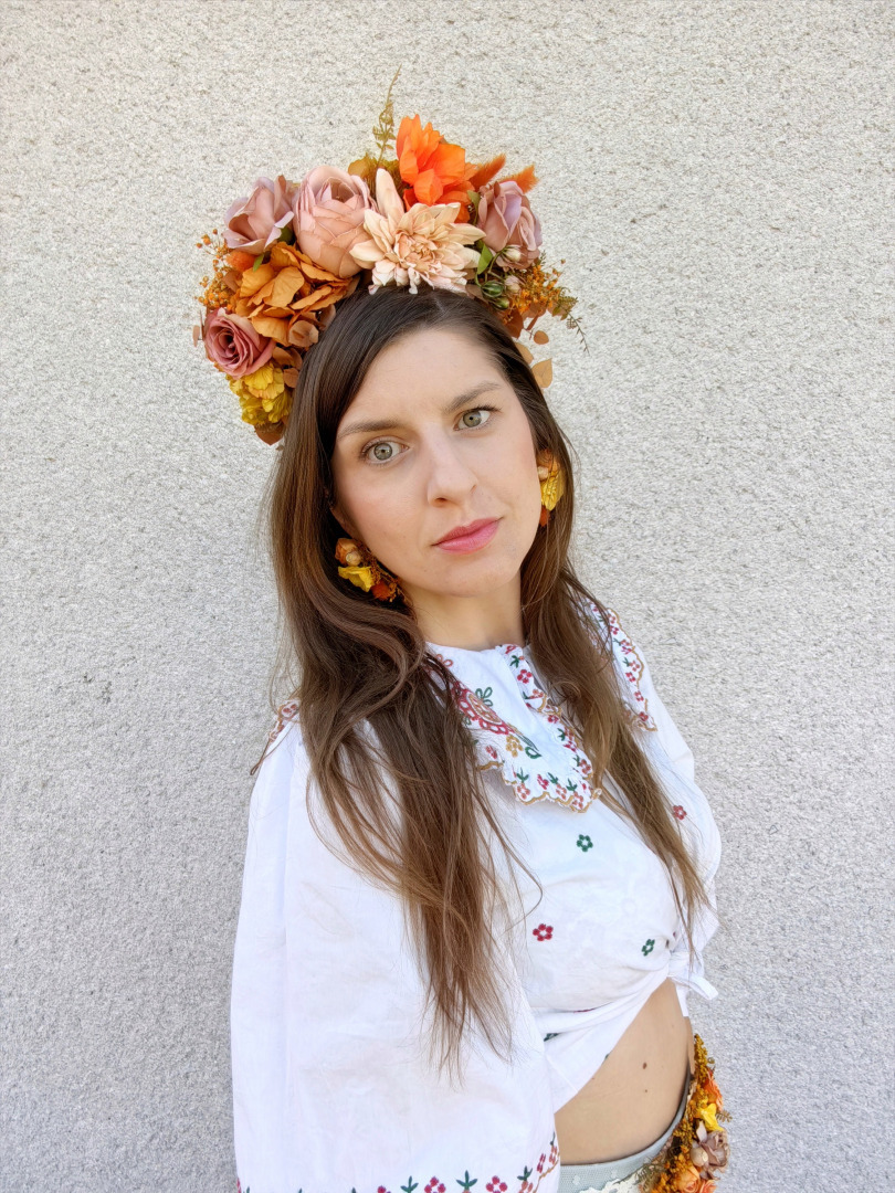 Veľká boho kvetinová čelenka inšpirovaná umelkyňou Fridou. Čelenky sú obojstranné,takže máte dva dizajny v jednom a možnosť nosiť z oboch strán.