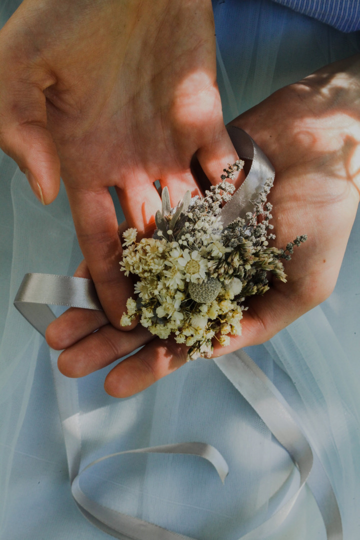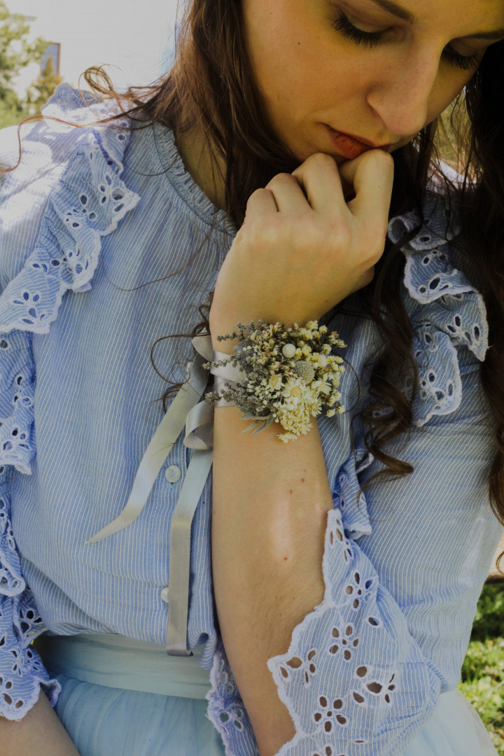 The flower bracelet is made of preserved flowers, leaves, grass, ribbon and other trinkets used for arranging.