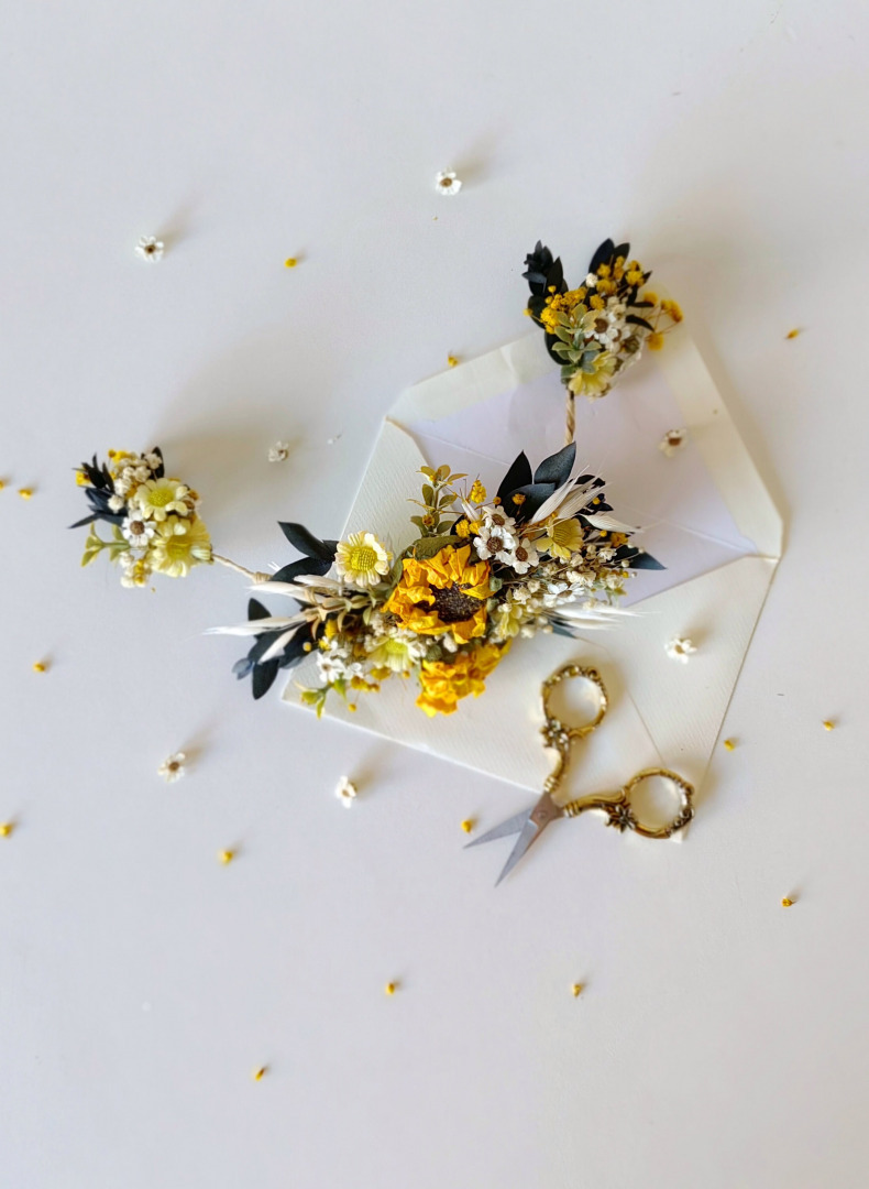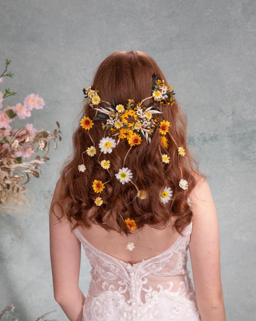 Romantic wedding hair arrangement/vine with veil. Yellow meadow design with sunflowers and daisy flowers...