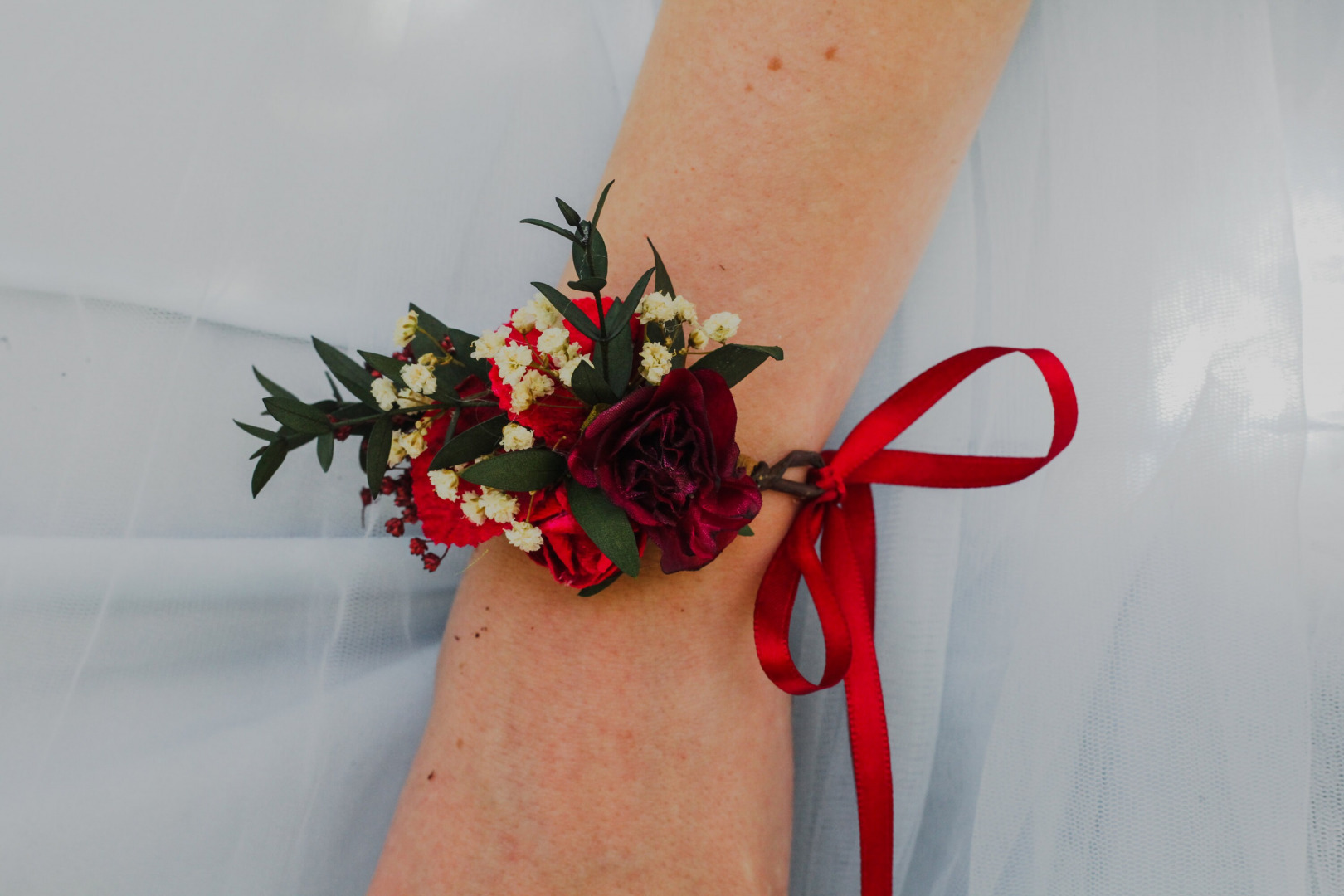 Burgundy/red and green flower bracelet on a wire with a ribbon to tie. Perfect for brides, bridesmaids or for proms, other events or just everyday look.