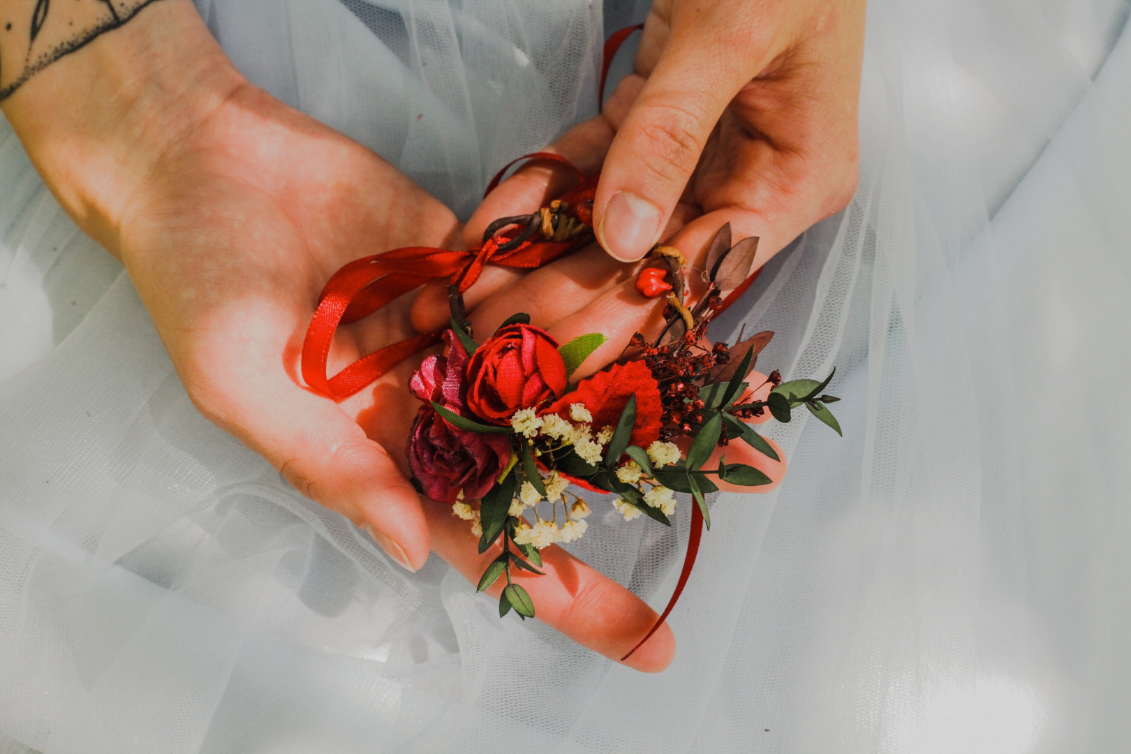 The flower bracelet is made of artificial flowers, preserved flowers, leaves, grass, ribbon and other trinkets used for arranging.