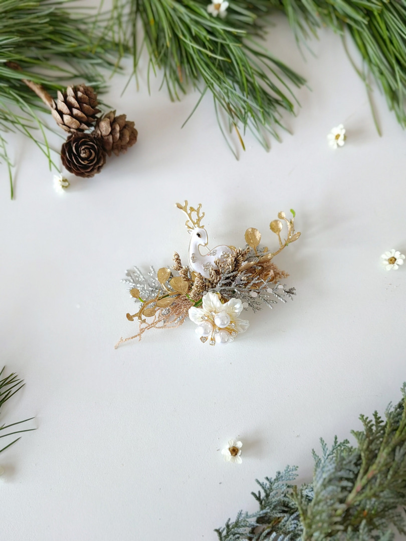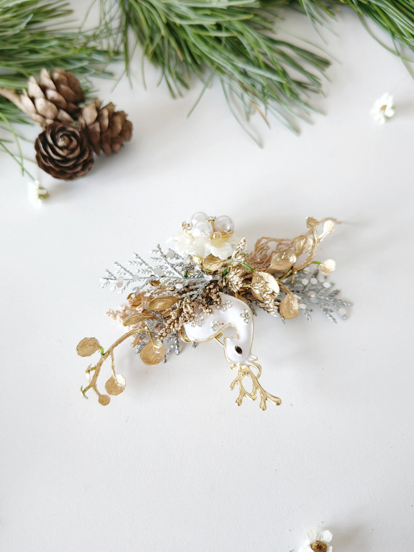 The brooch is made of artificial and preserved material, doe with strass, and other arranging material.