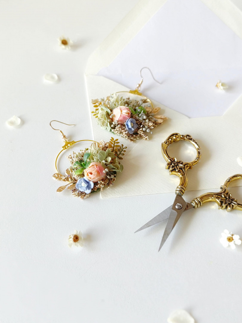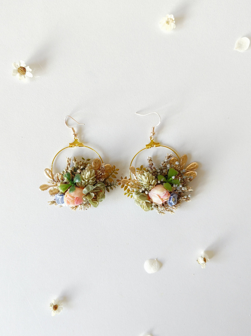 The earrings are made of artificial flowers, preserved material and other arranging material.