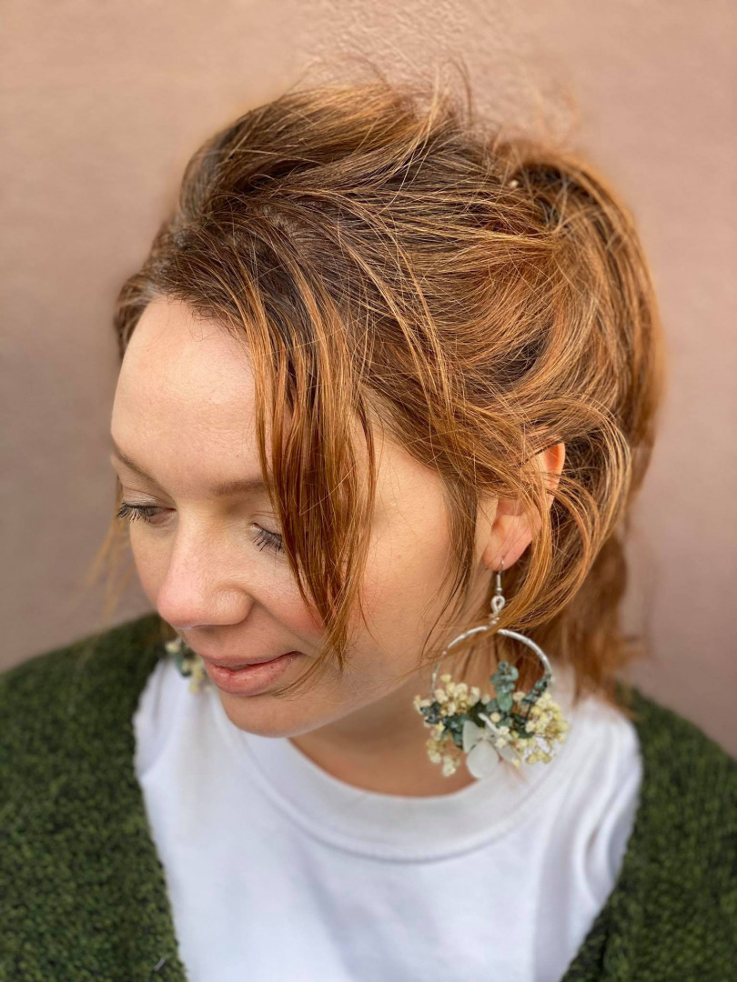 The earrings are made of preserved flowers, leaves and grass, wire, and other trinkets used for arranging :)