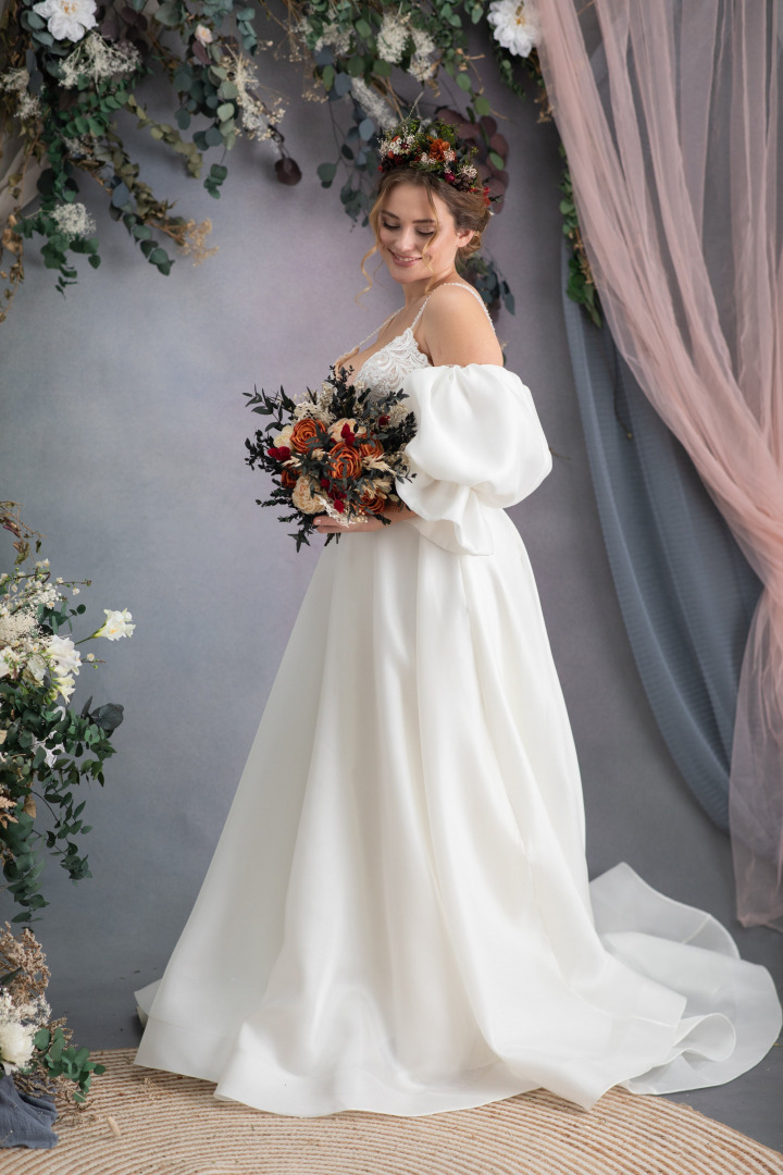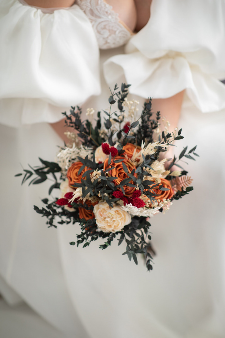 Svadobná boho kytica z umelých a konzervovaných materiálov. Životnosť kytice je pri správnom skladovaní a starostlivosti 10-15 rokov (viac sa dozviete v sekcii STAROSTLIVOSŤ). Kyticu nikdy nedávajte do vody