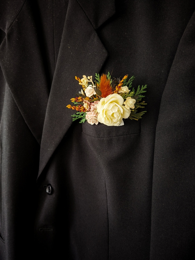 Pierko je vyrobené z textilných kvetov a konzervovaných materiálov. Životnosť je 10-15 rokov pri správnom skladovaní.