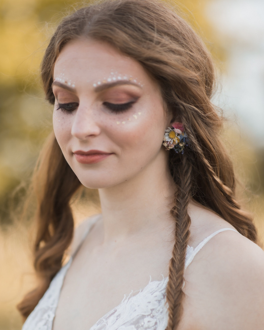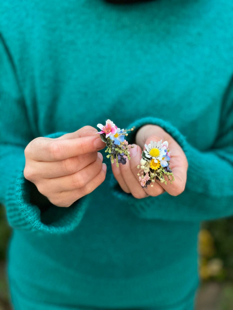 The earrings are made of artificial flowers, preserved material and other arranging material.