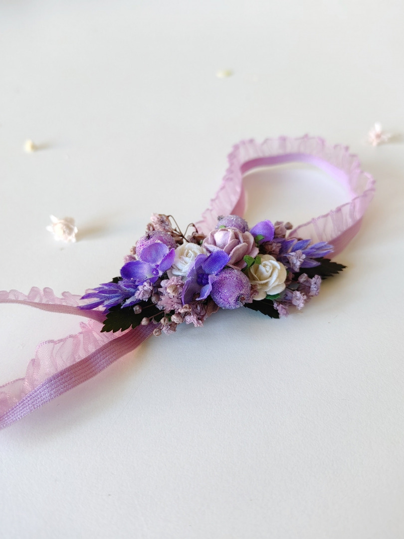 Svadobný kvetinový podväzok pre nevestu vo fialových tónoch na elastickej podväzkovej gumičke.