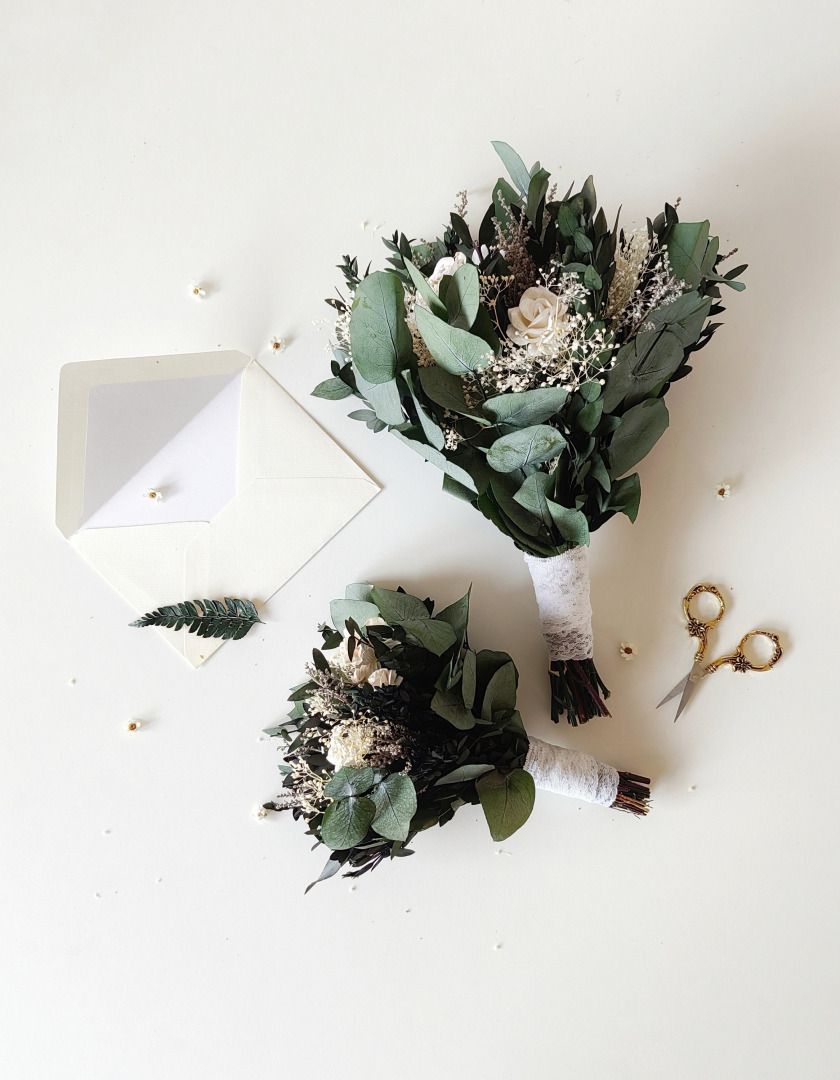 Svadobná boho kytica z umelých a konzervovaných materiálov. Životnosť kytice je pri správnom skladovaní a starostlivosti 10-15 rokov (viac sa dozviete v sekcii STAROSTLIVOSŤ). Kyticu nikdy nedávajte do vody