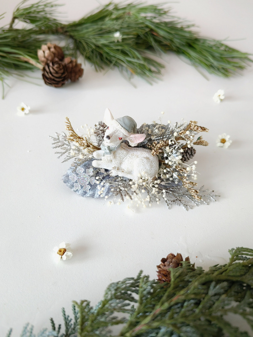 The brooch is made of artificial and preserved material, fawn and other arranging material.