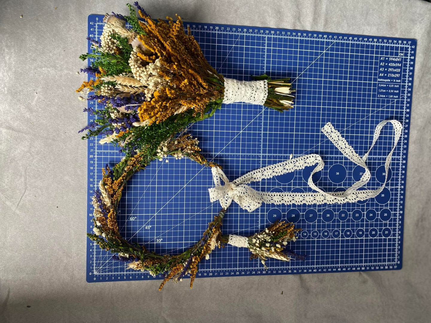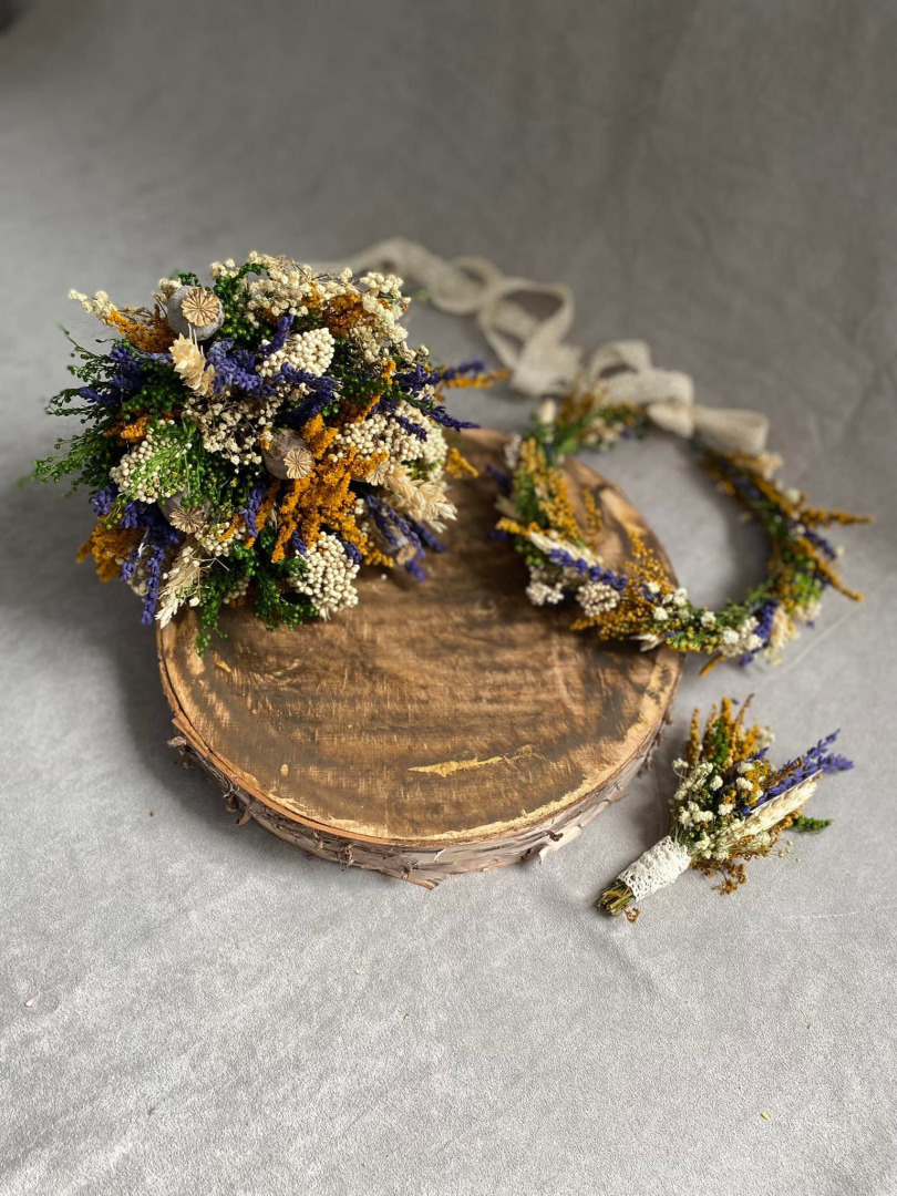 Pierko je vyrobené z konzervovaných tráv, gypsomilky, levandule, kláskov, drôtiku a floristickej pásky...