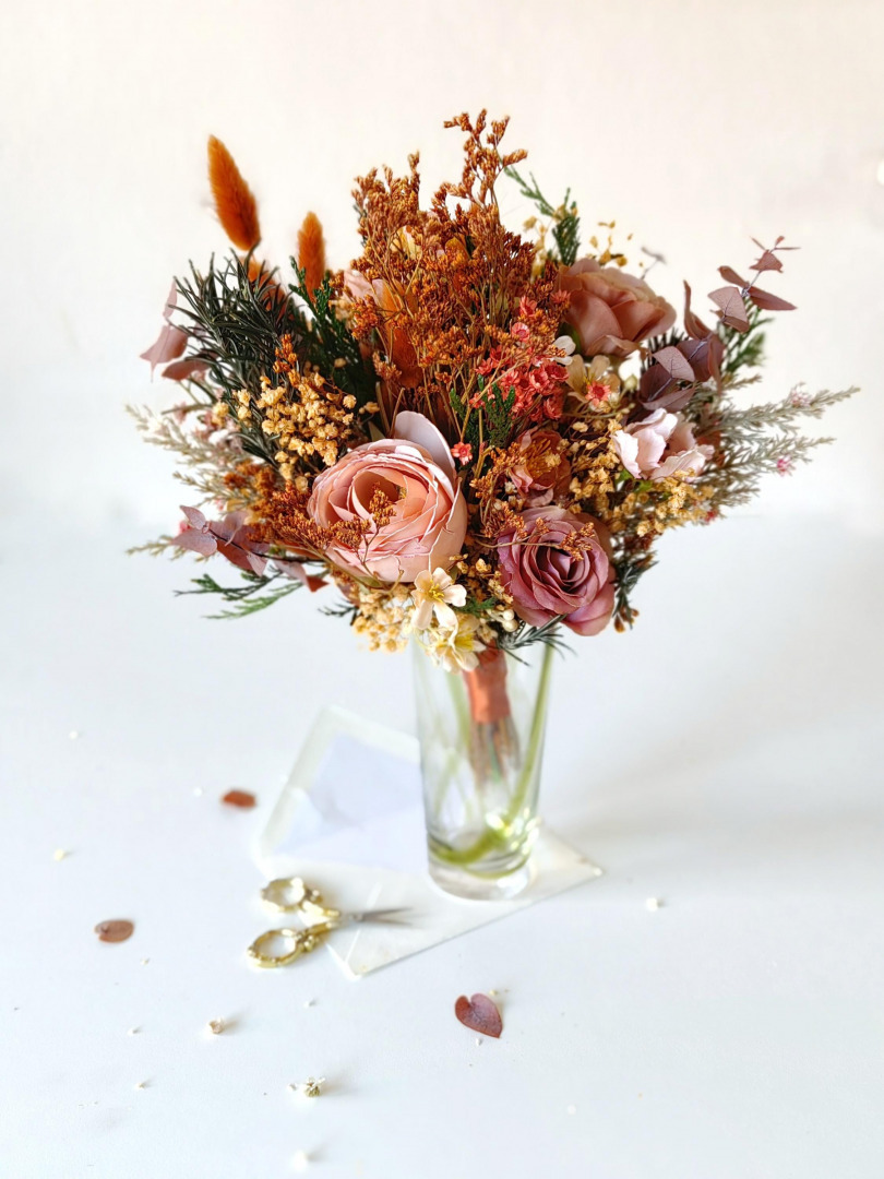 Svadobná boho kytica z umelých a konzervovaných materiálov. Životnosť kytice je pri správnom skladovaní a starostlivosti 10-15 rokov (viac sa dozviete v sekcii STAROSTLIVOSŤ). Kyticu nikdy nedávajte do vody