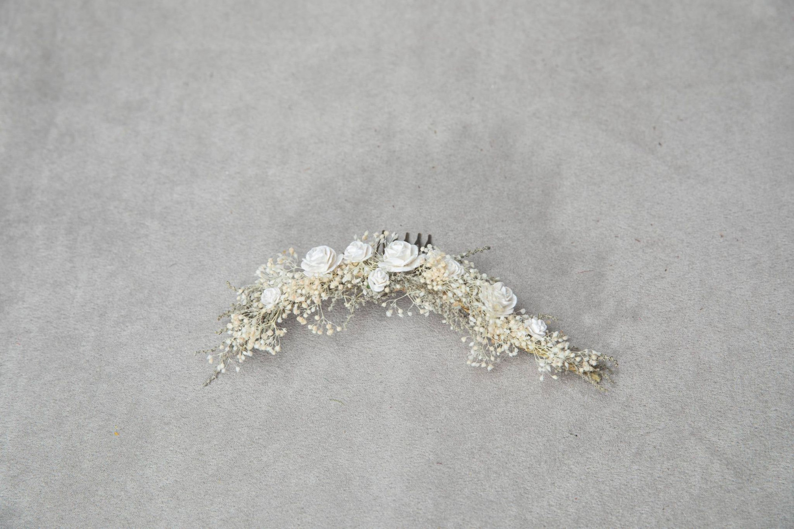 The flower comb is made of handmade paper flowers, leaves, grass, wire and other trinkets used for arranging :)