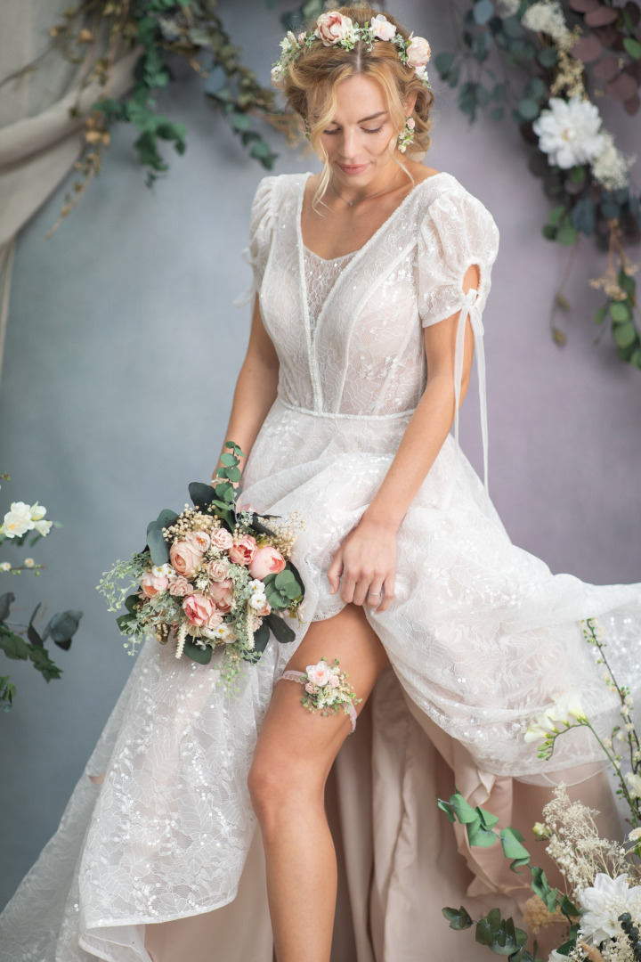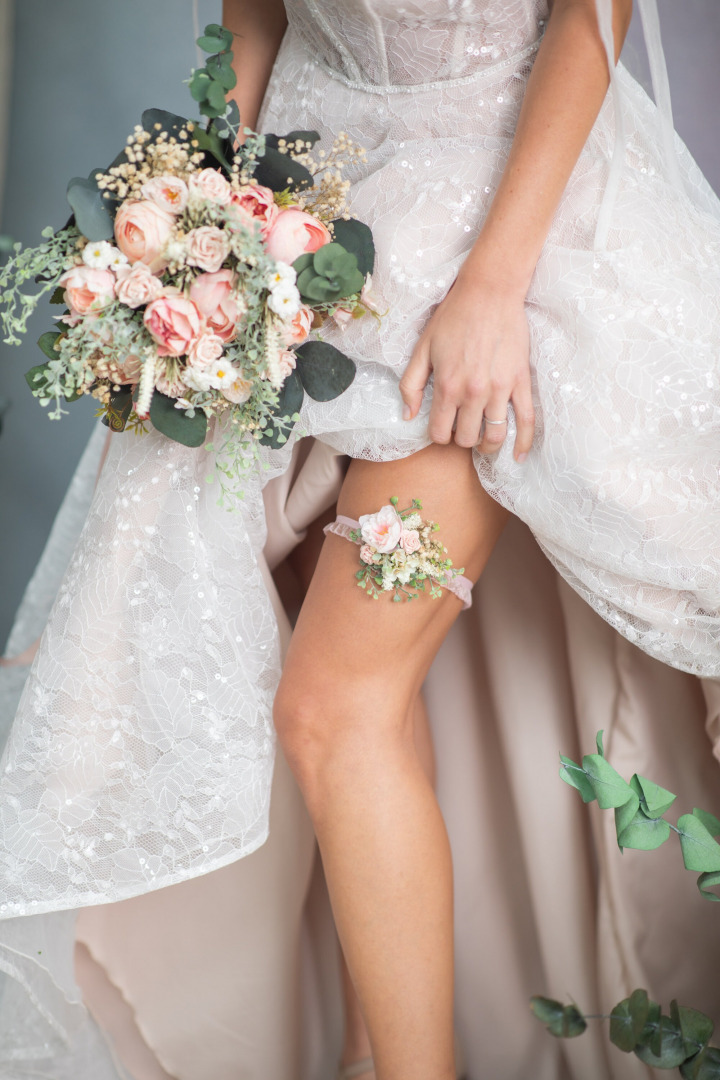 Kvetinový boho podväzok pre nevestu na elastickej podväzkovej gumičke.