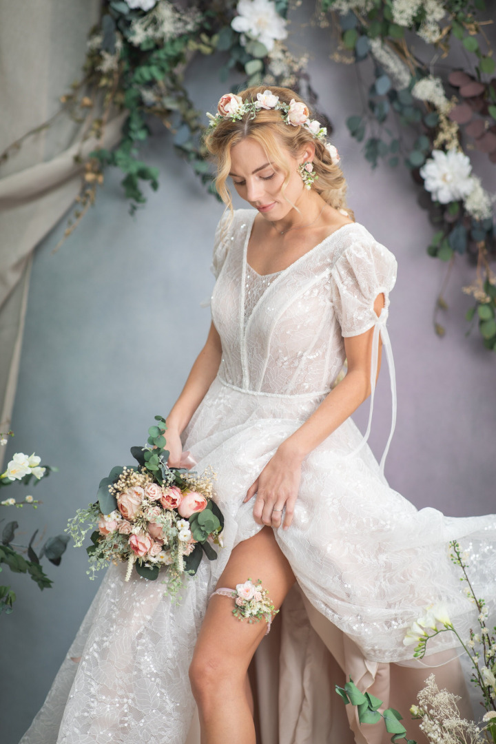 Kvetinový podväzok na elastickej podväzkovej gumičke. Pri objednávke uveďte požadovaný obvod stehna.