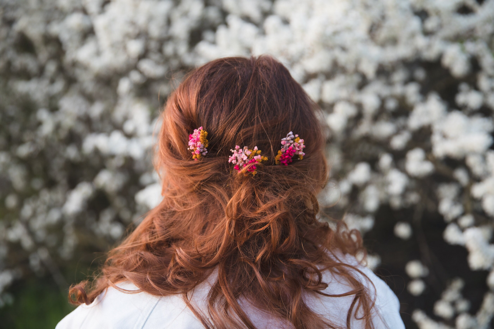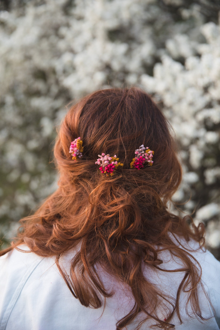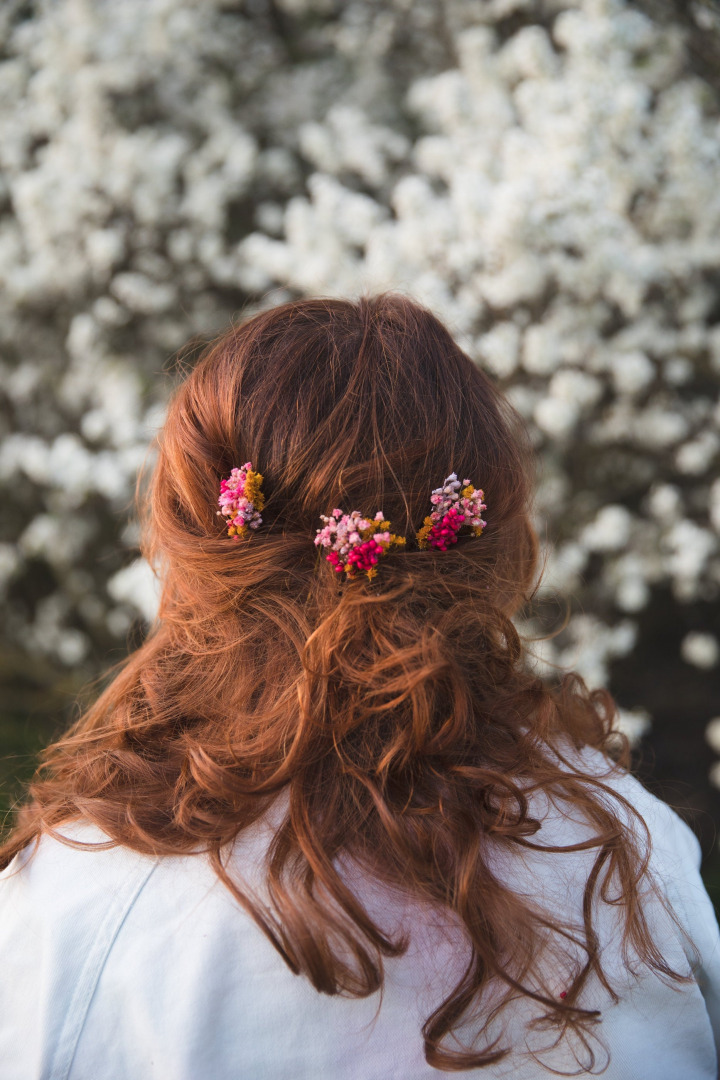 The flower hairpins are made of natural preserved and dried material which makes them a bit more fragile.