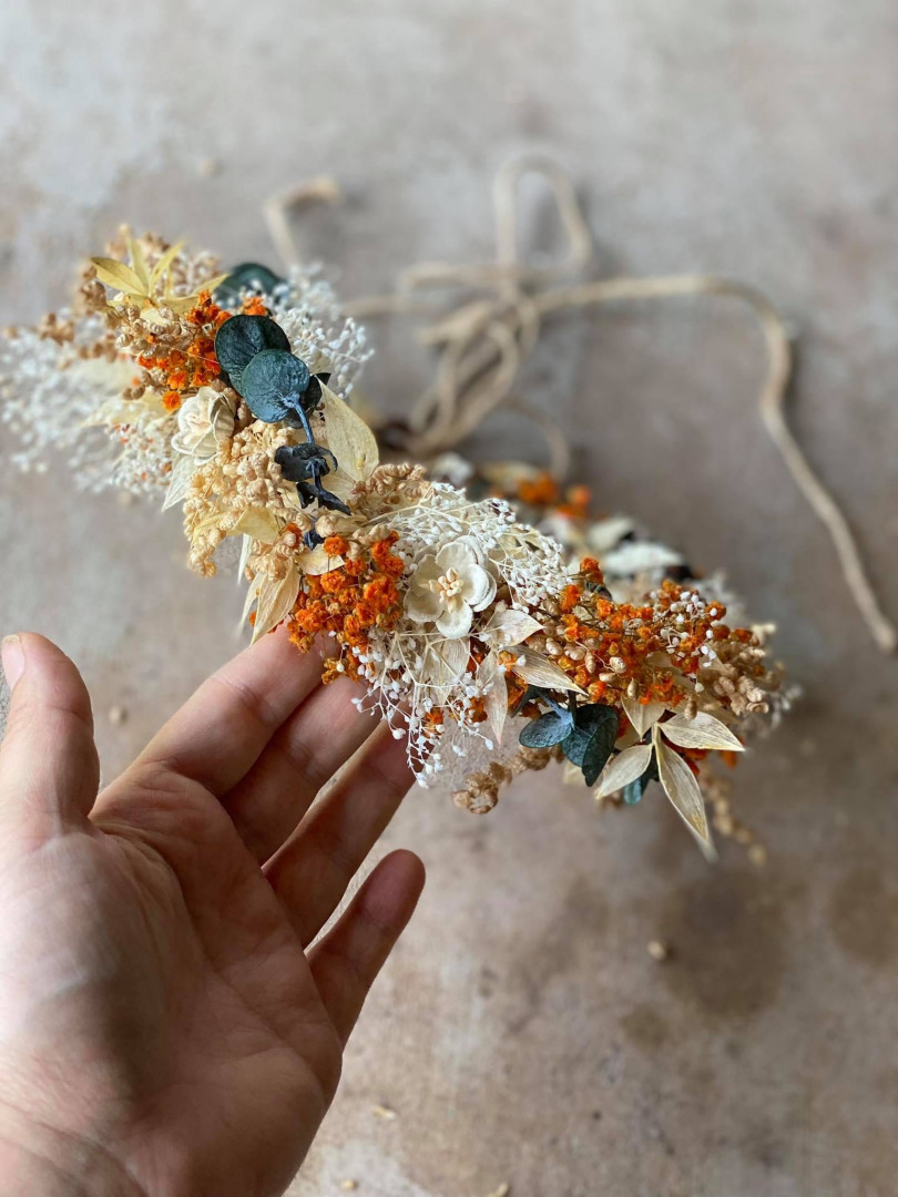 Kvetinový venček v boho rustikálnom dizajne. Obvod venčeku je 48-53 cm. Veľkosť je univerzálna, venček sa viaže a prispôsobuje viazaním stuhou v zadnej časti.