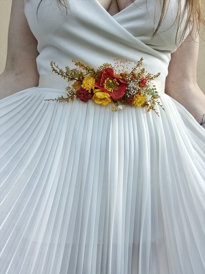 Bridal flower belt with poppy flowers. Boho summer design in red and yellow combination.