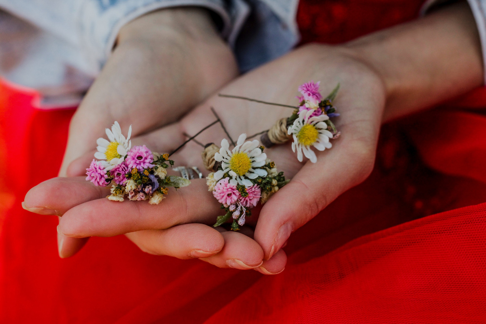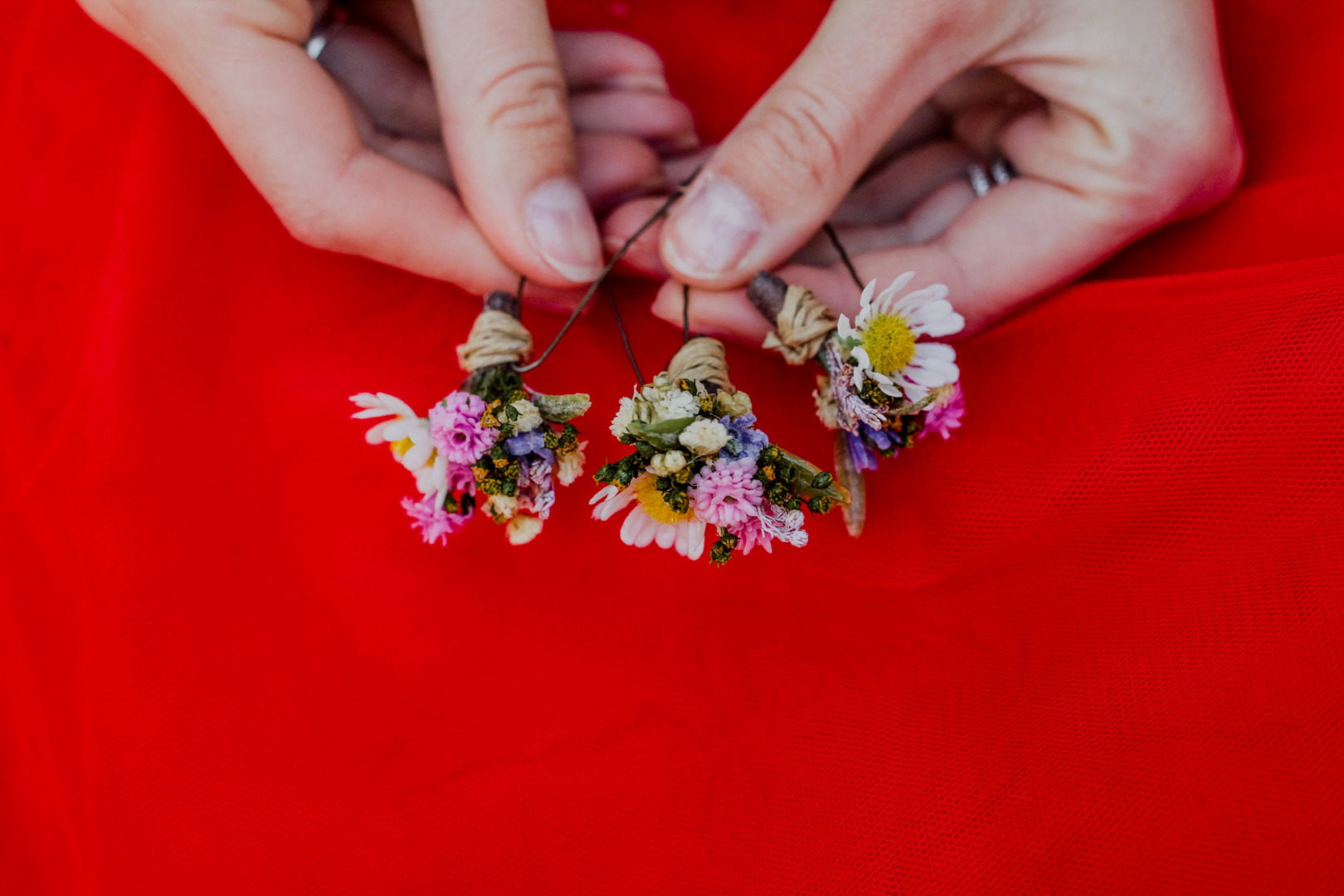 The hair pin is made of artificial and preserved flowers, grass, leaves, and other trinkets used for arranging :)