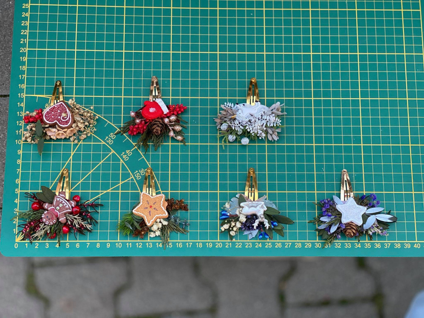The hair clips are made of artificial and preserved flowers, leaves, gingerbread, floristic tape and other arranging material.