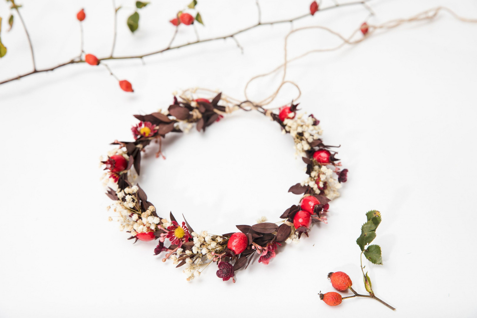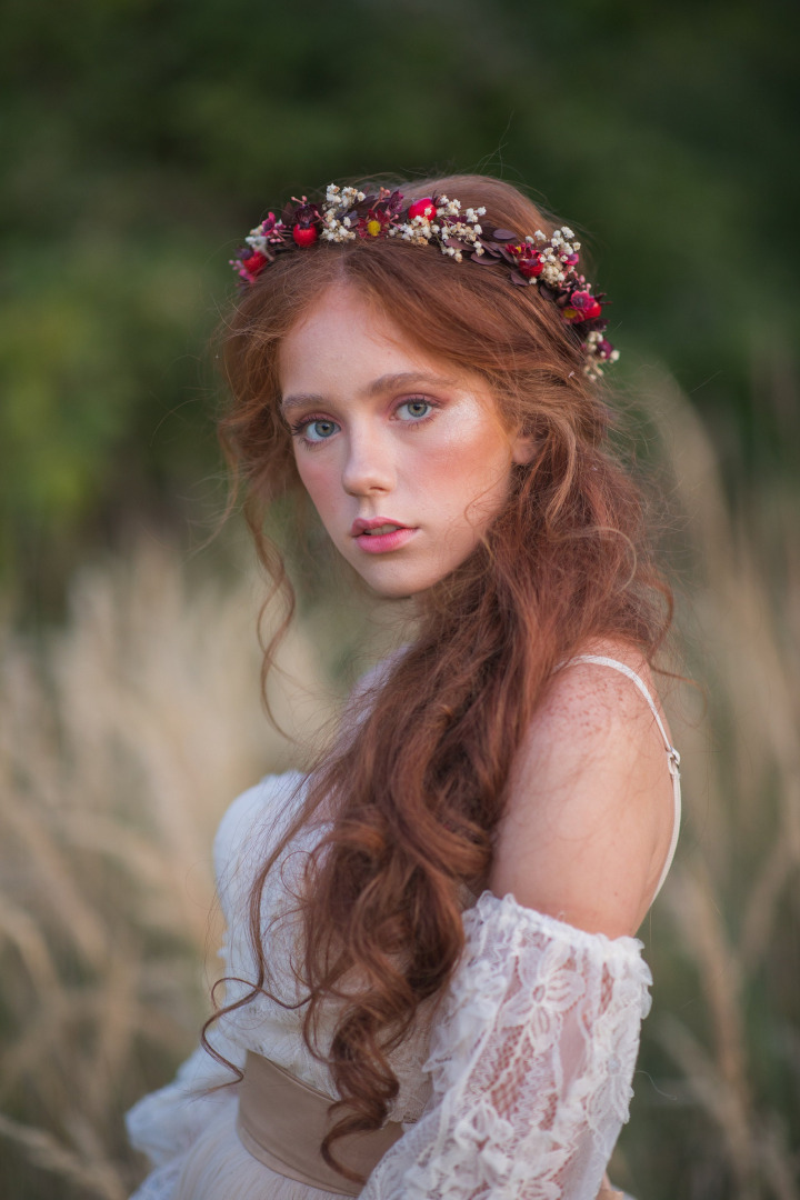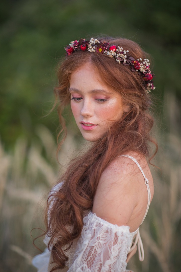 Kvetinový venček v zemitých jesenných tónoch. Obvod venčeku je 48-53 cm. Veľkosť je univerzálna, venček sa viaže a prispôsobuje viazaním stuhou v zadnej časti.