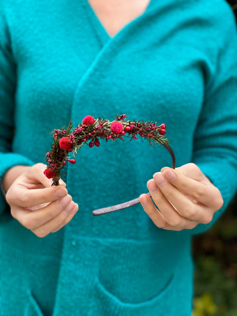 Čelenka je vyrobená z konzervovaných kvietkov, lístkov, trávy, ihličia a iných drobností určených k aranžovaniu.