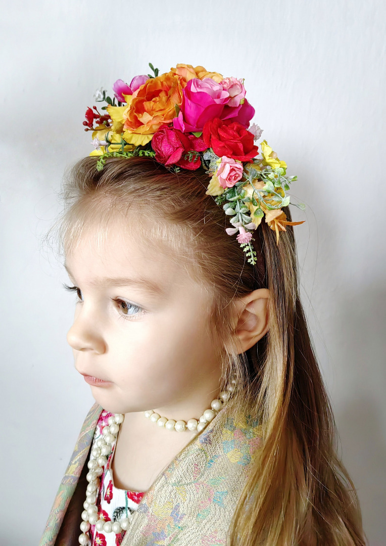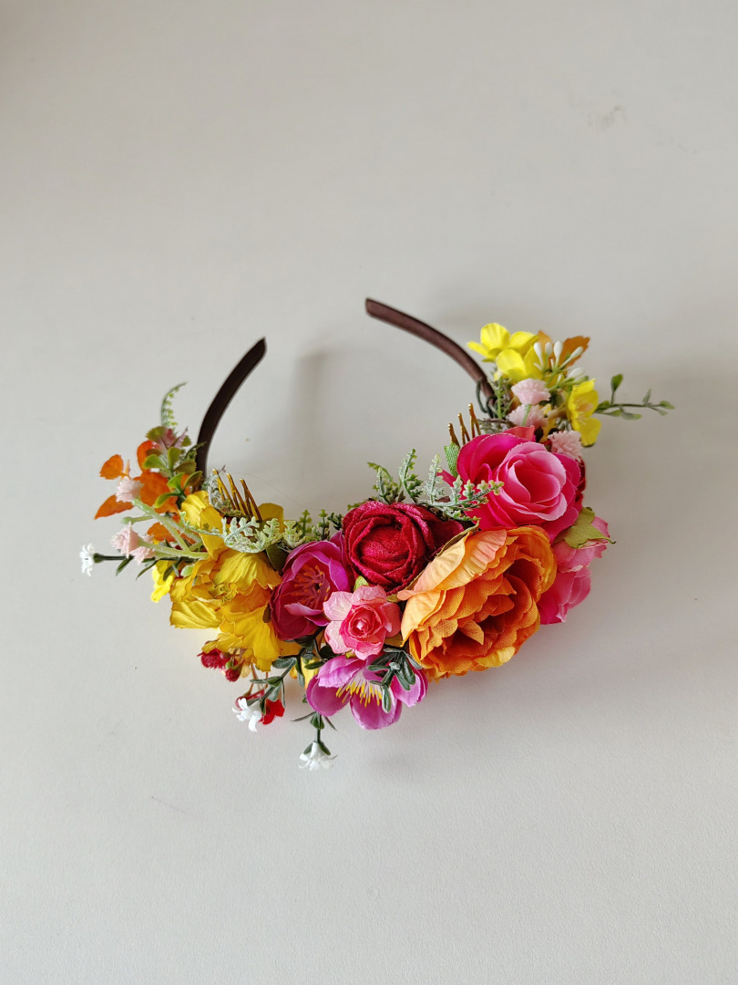 Veľká kvetinová čelenka v boho štyle inšpirovaná mexickou umelkyňou Fridou Kahlo. Čelenka je obojstranná a môžete ju nosiť z oboch strán. Vhodná predovšetkým na vypnuté účesy. Určená na boho svadbu,svadbu na záhrade,ale aj na špeciálne príležitosti ako je Halloween,letný festival či doplnok k líčeniu v Muerta štyle.
