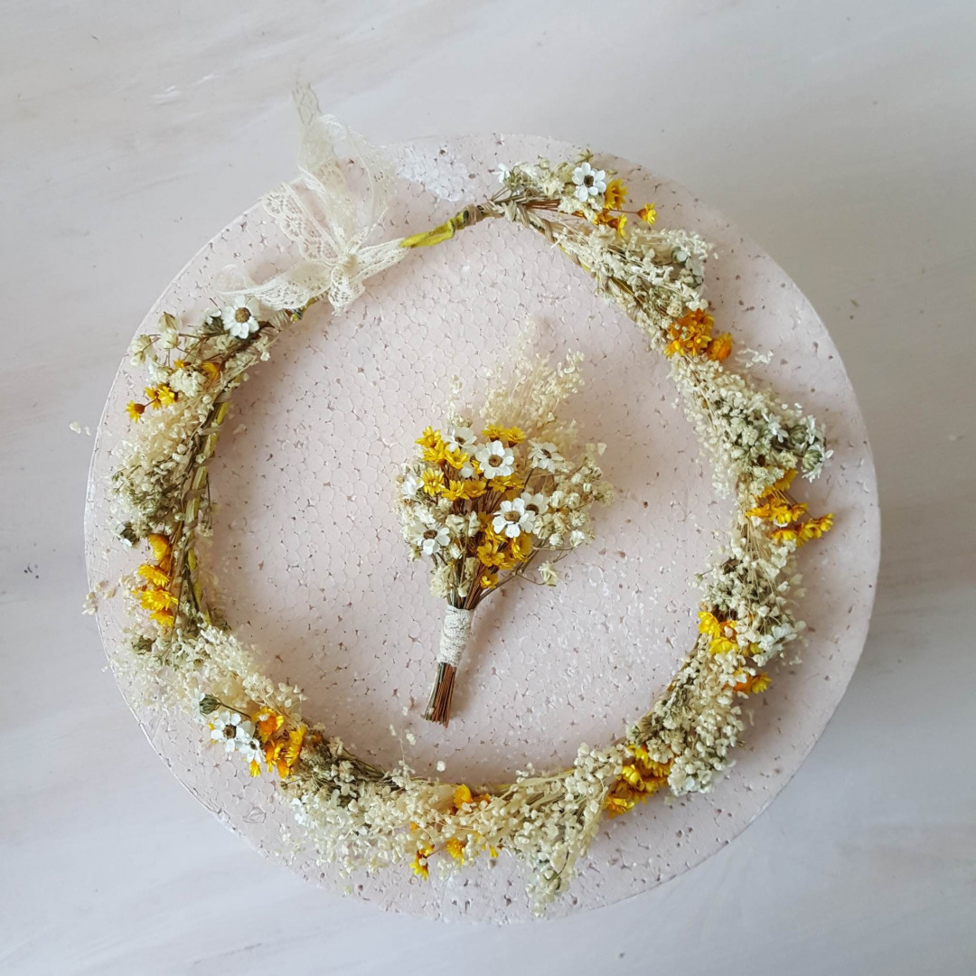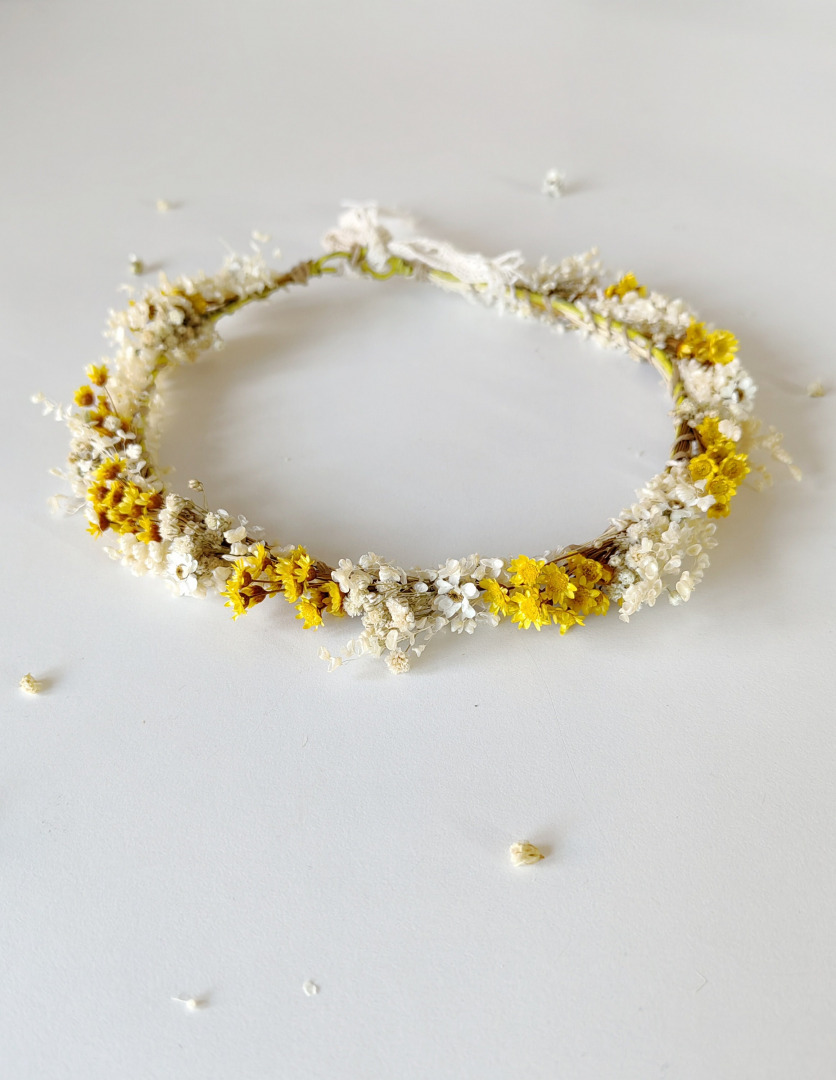 The flower hair crown is made of preserved flowers, grass and other trinkets used for arranging. It is fragile, some flowers can fall off but it is normal and it won't change the overall look of the crown.