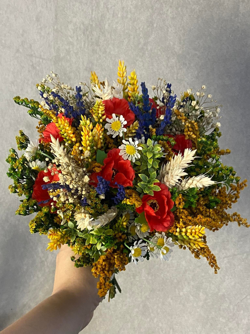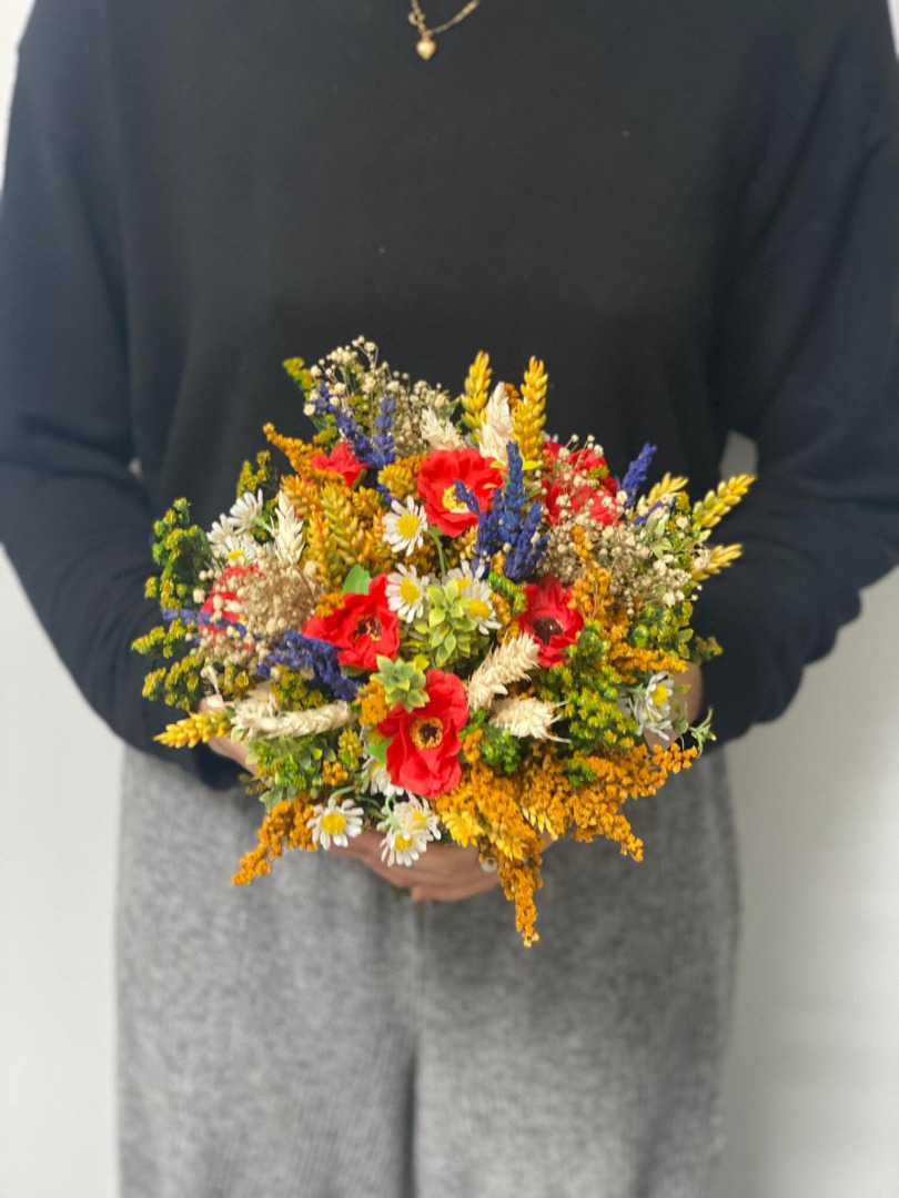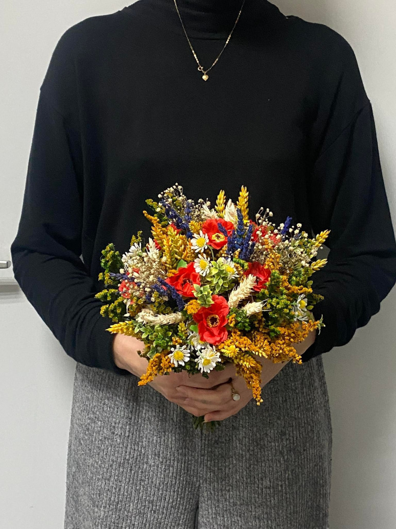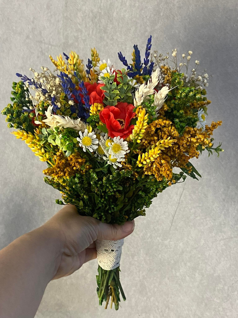 Svadobná kytička vo folk štýle vyrobená z textilných kvetov, doplnená o konzervovaný materiál, sušinu a iný aranžérsky materiál