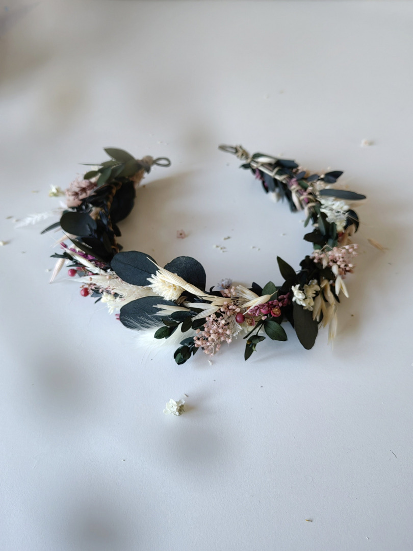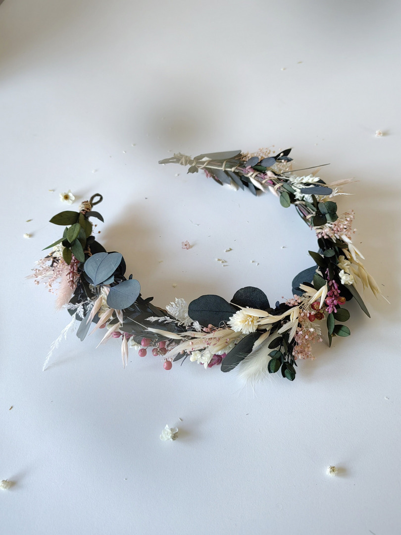 The half crown is made of preserved and dried flowers, grass, leaves and other trinkets used for arranging :)