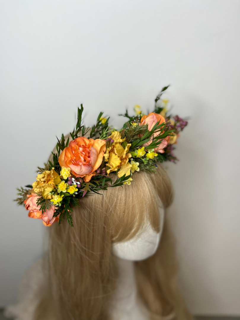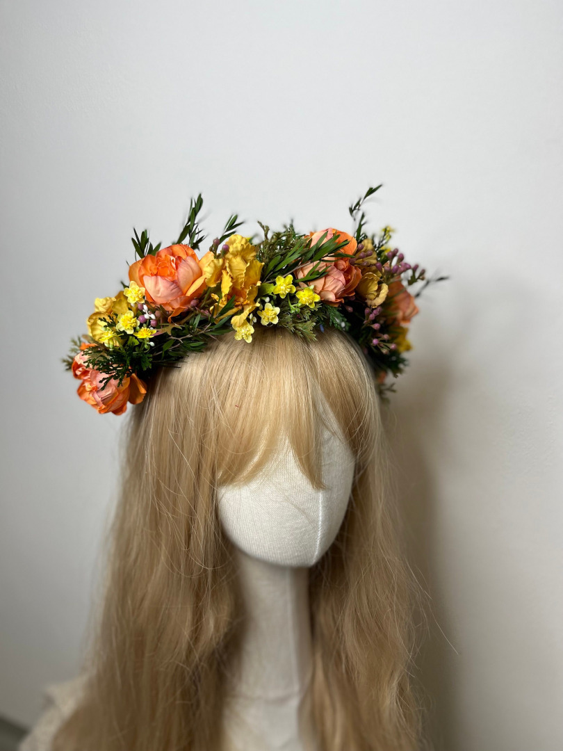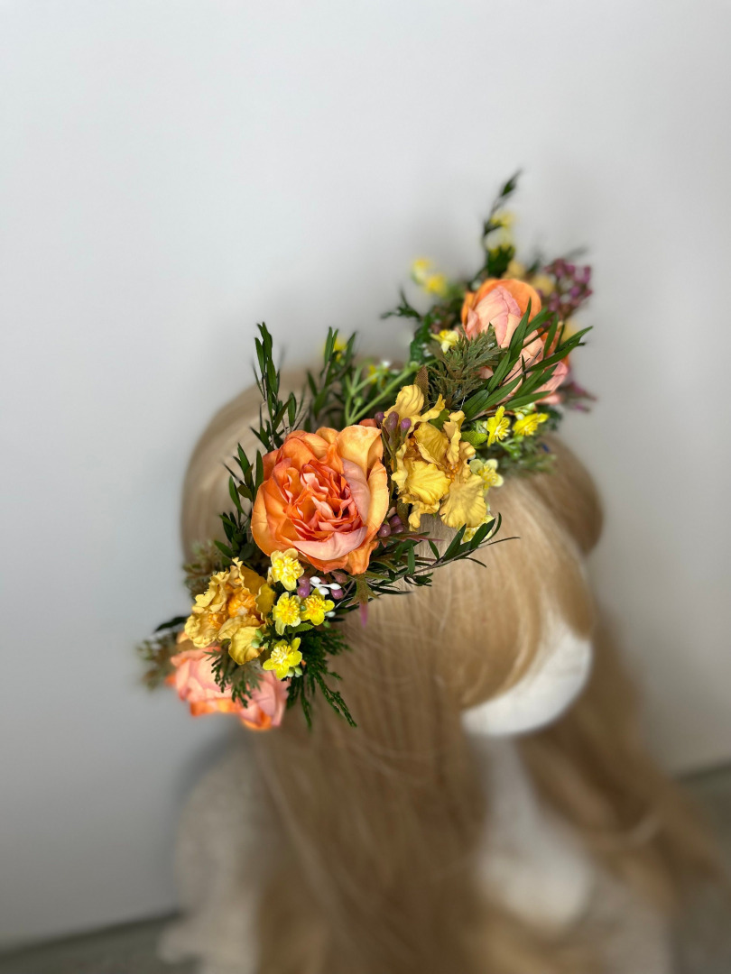 Sunset flower half wreath Autumn wedding crown Meadow bridal wreath Yellow Summer crown Orange Bridal accessories Large boho wreath Magaela