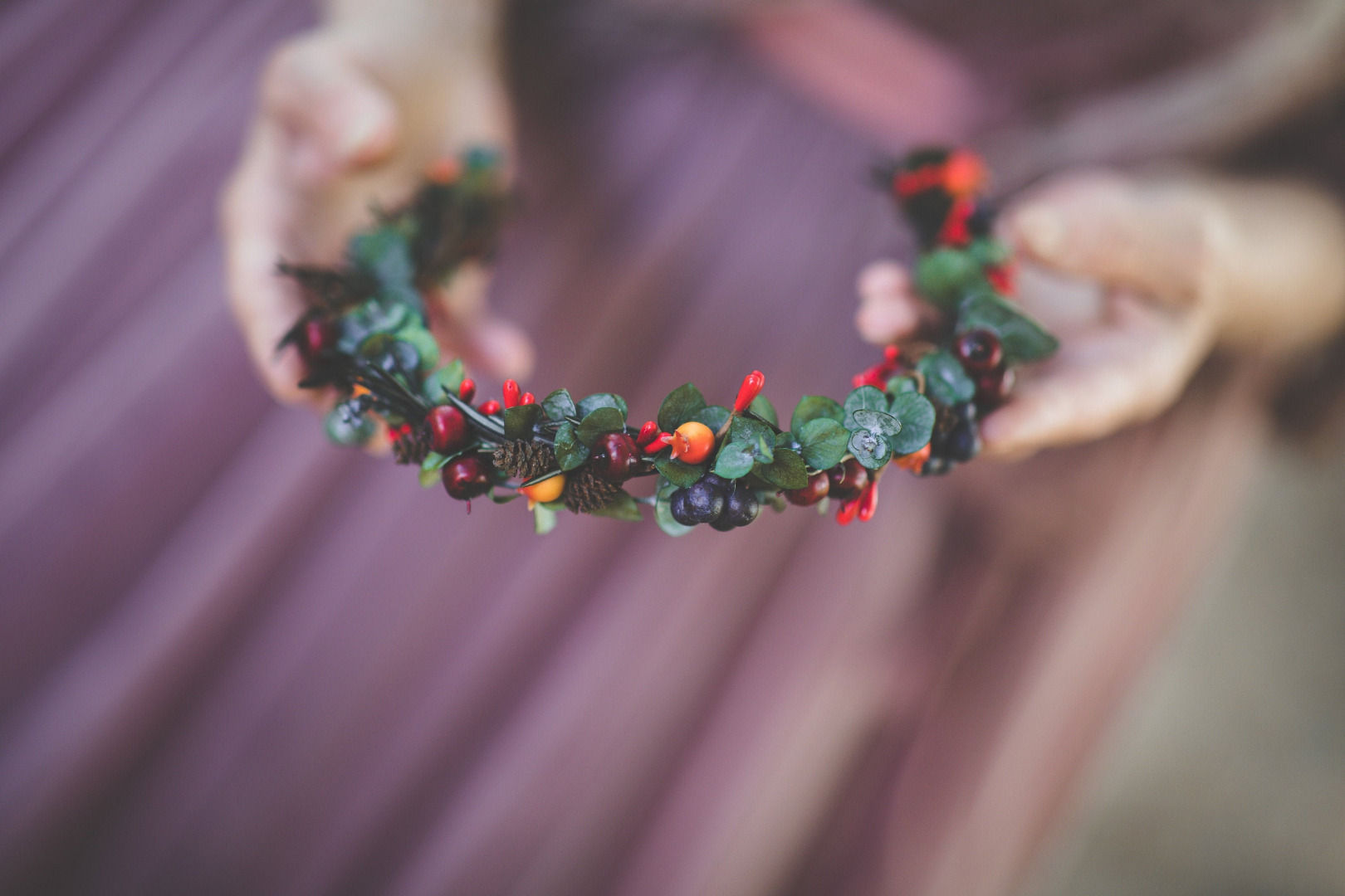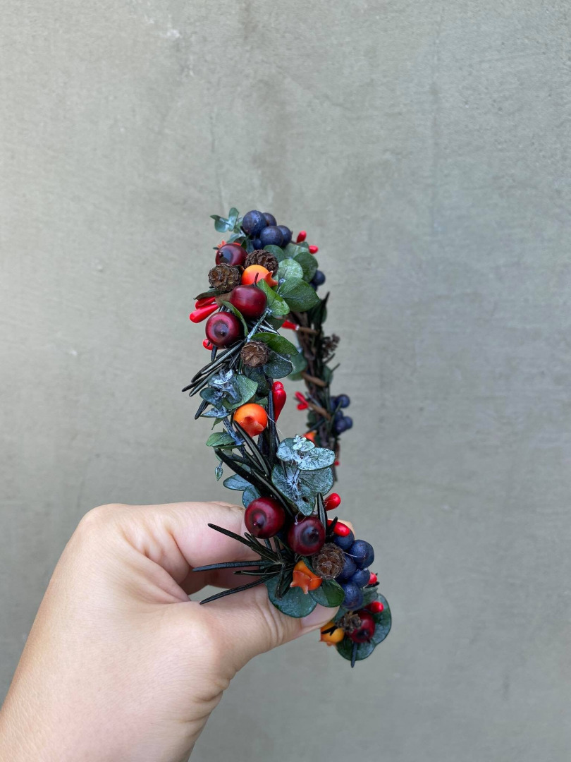 The half wreath is made of artificial/textile leaves, preserved leaves, berries, fruits, pine cones, wire and other trinkets intended for arranging. Suitable for weddings or everyday use :)