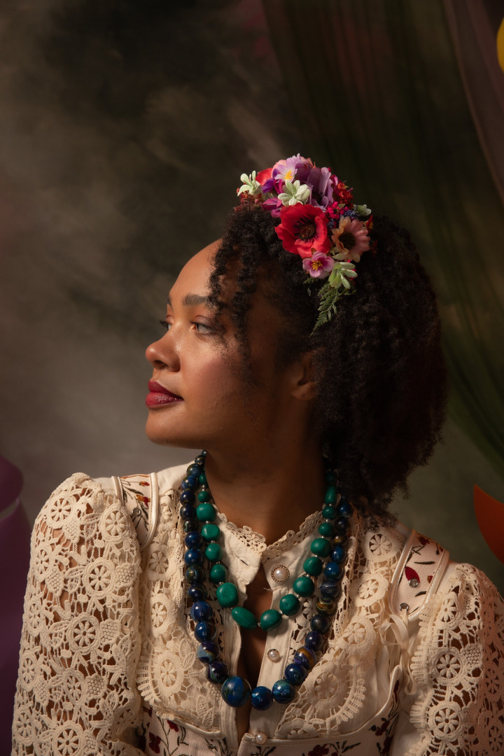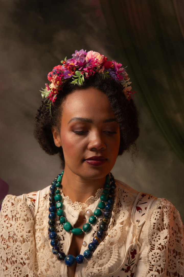 Frida Kahlo inspired flower headband in pink and purple tones.