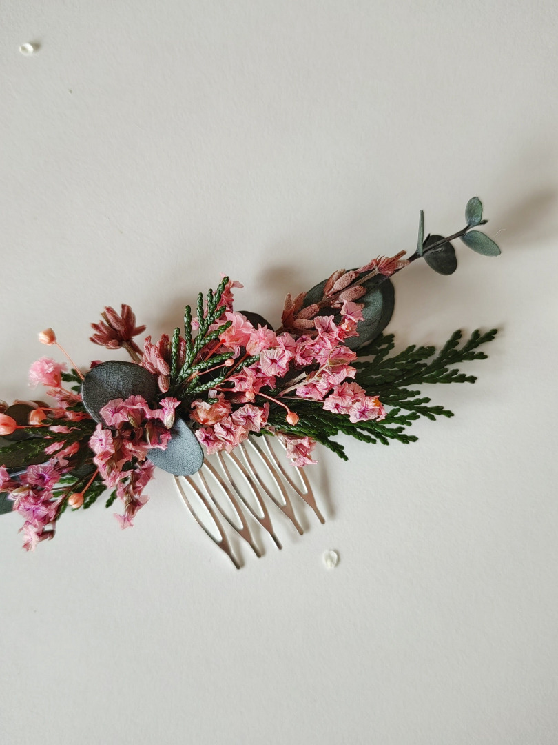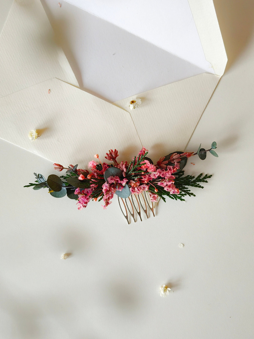 DUE TO ITS MATERIAL, IT HAS A SPECIFIC FRAGRANCE. The length of the comb is approx. 14-15 cm. The size of the boutonniere is approx. 10-11 cm