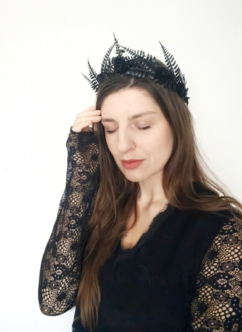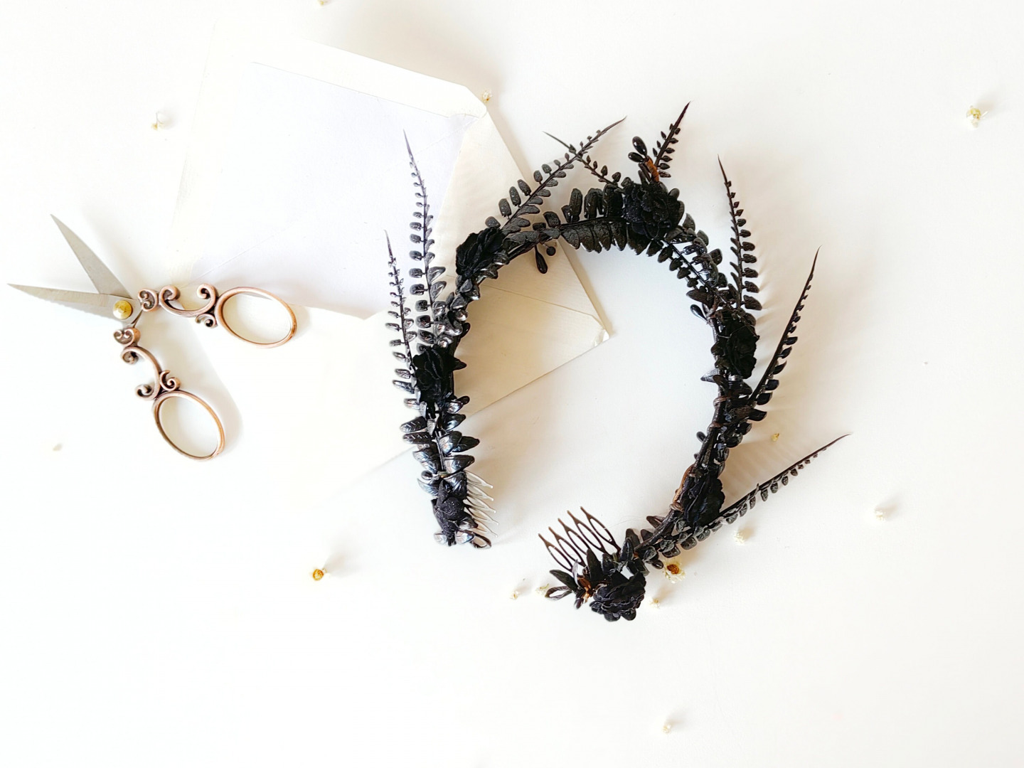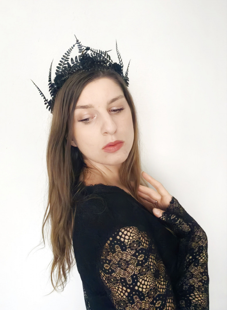 The flower crown is made of artificial flowers, leaves, grass, wire, floristic tape and other trinkets used for arranging.