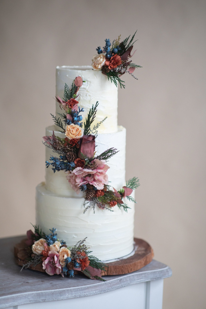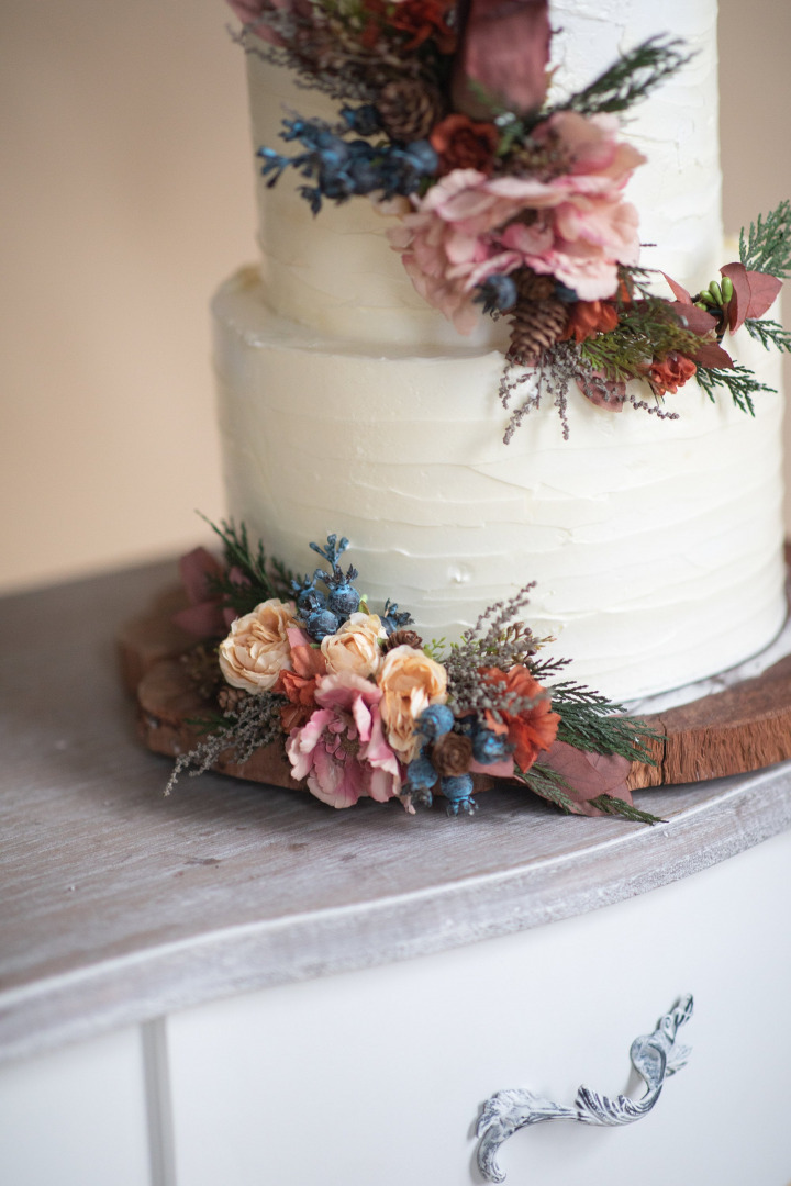 Ozdoby v troch veľkostiach na svadobnú tortu sú vyrobené z textilných kvetov, lístkov, konzervovaných materiálov, drôtiku a iných drobností určených k aranžovaniu.