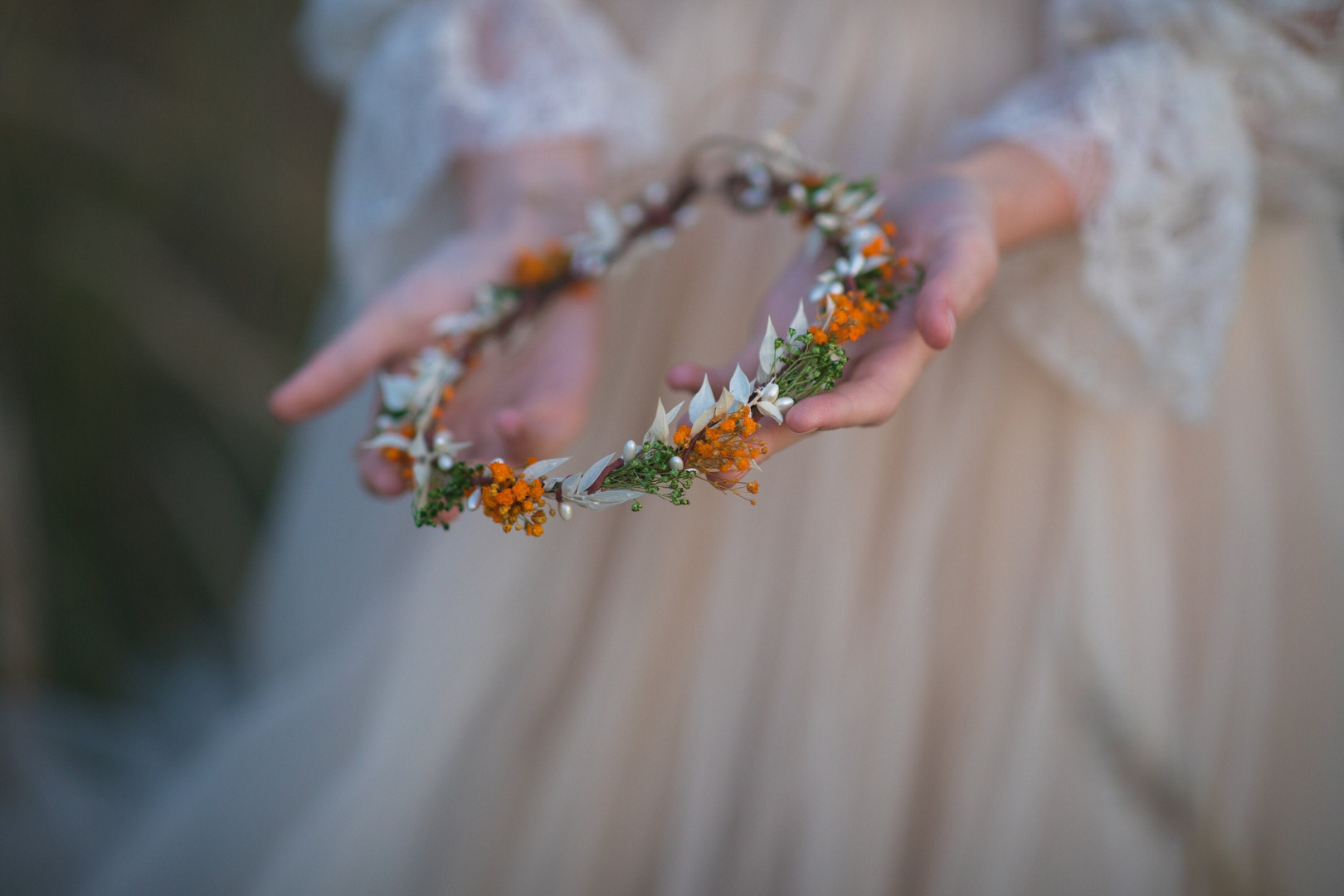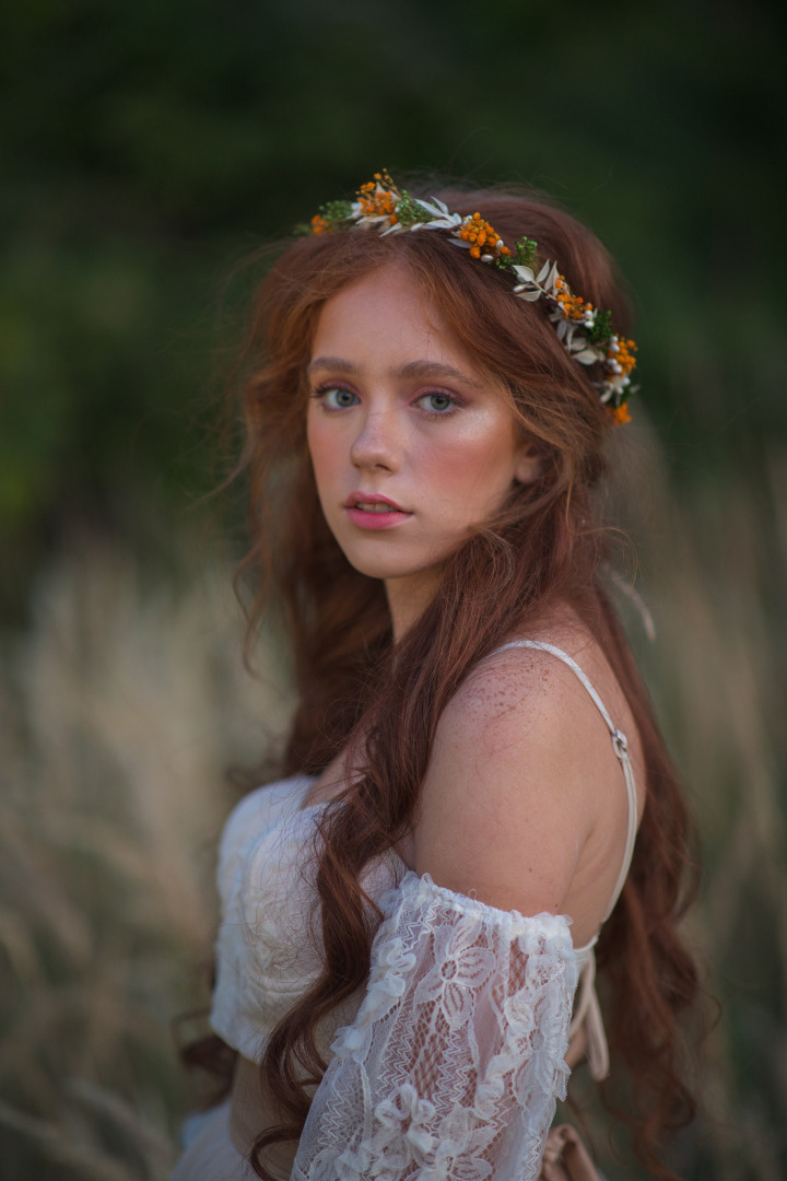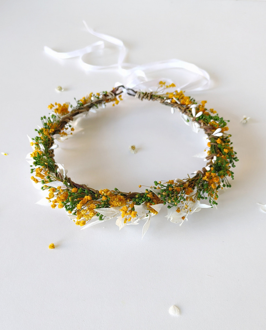 Kvetinový venček v jesenných tónoch. Obvod venčeku je 48-53 cm. Veľkosť je univerzálna, venček sa viaže a prispôsobuje viazaním stuhou v zadnej časti.
