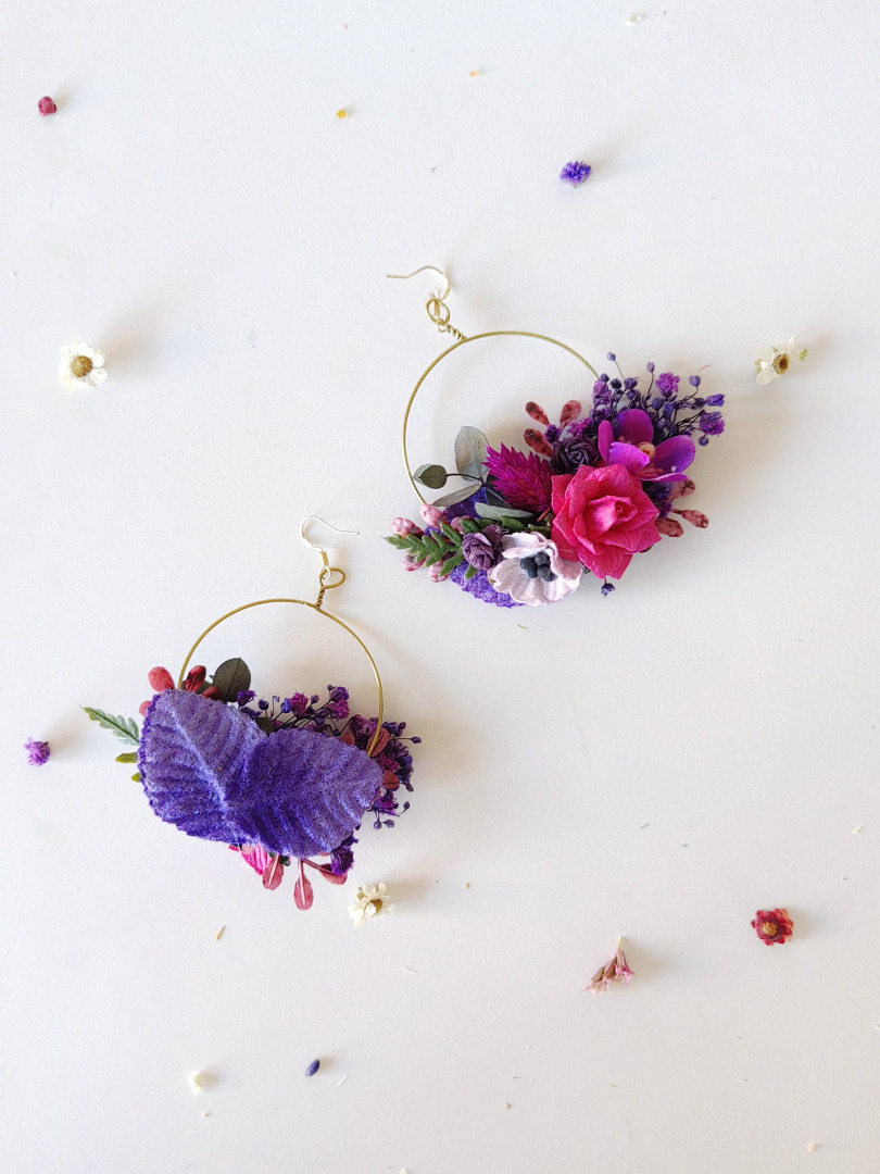The earrings are made of artificial flowers, preserved material and other arranging material.