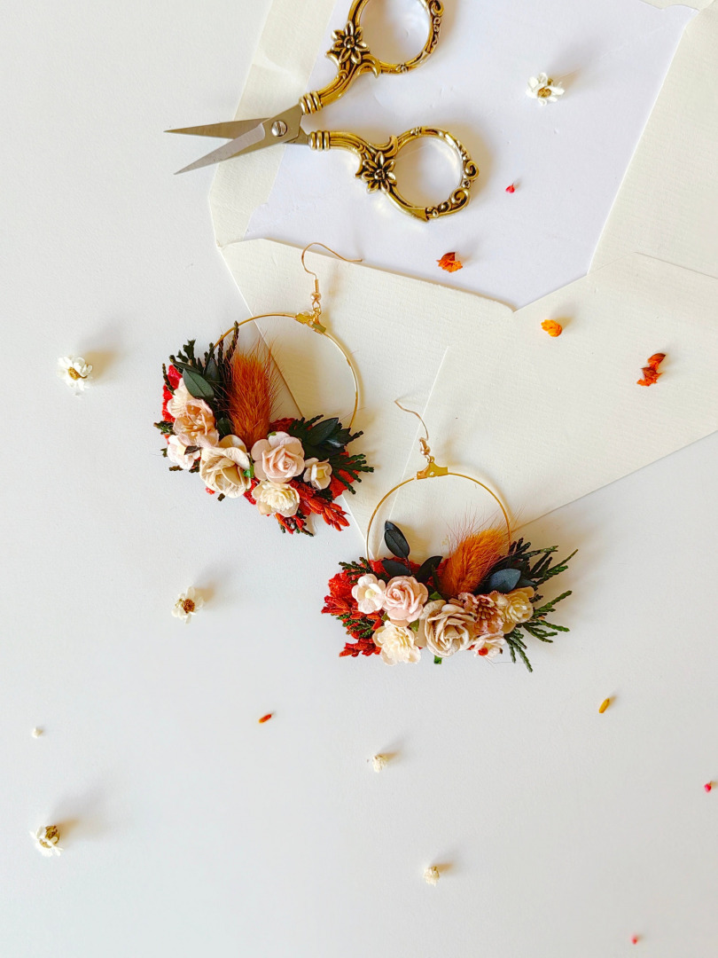 Terracotta circle earrings Autumn wedding flower earrings Circle flower earrings Woodland design Wedding jewellery Burnt orange Magaela