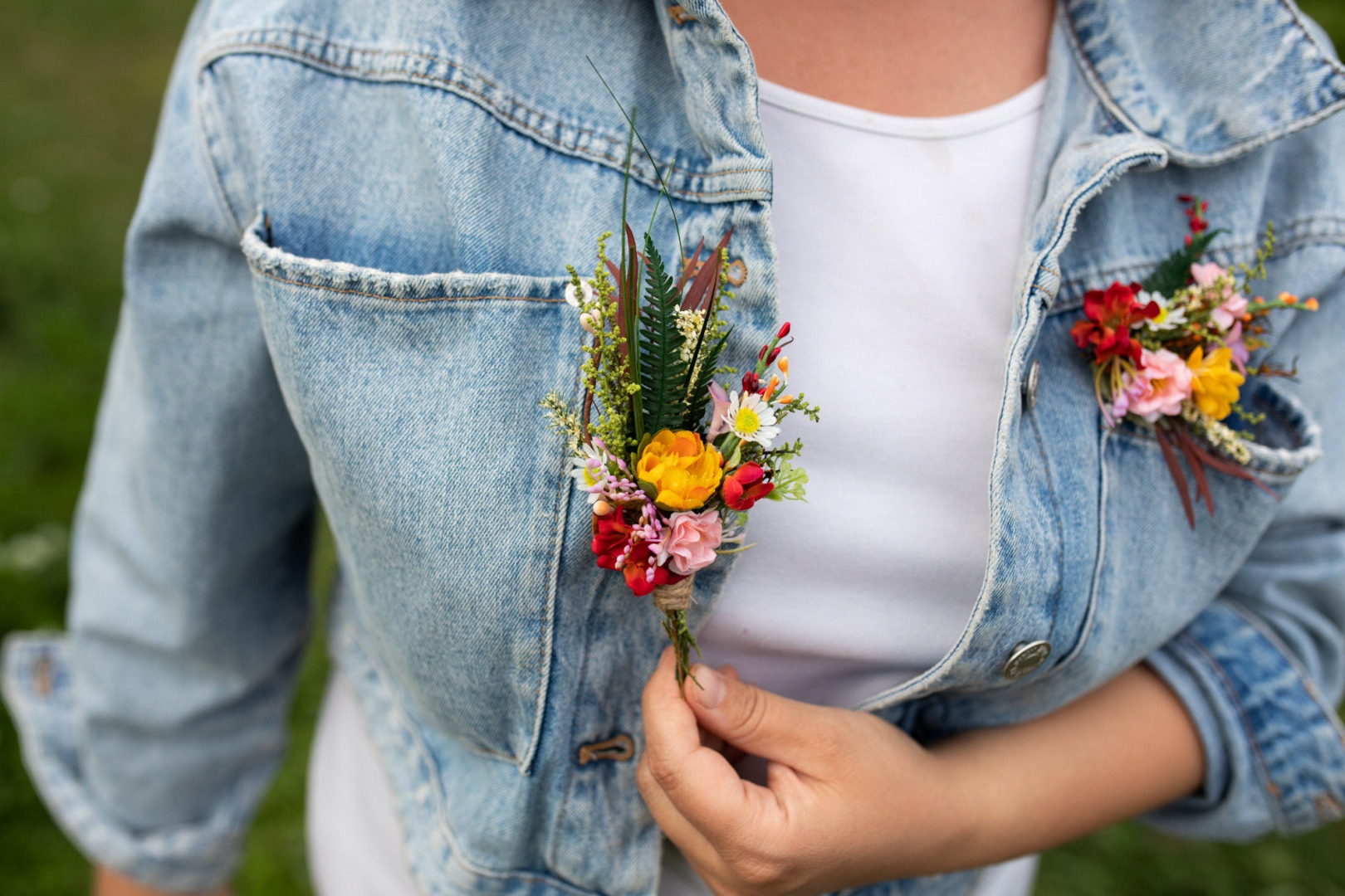 Pierko je vyrobené z textilných a sušených kvetov, ktoré sú doplnené konzervovaným a umelým materiálom.
